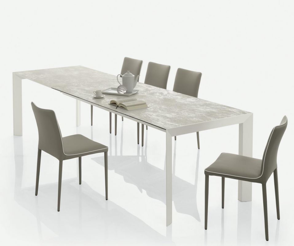 Table with extensions and lacquered Metal frame.Top in veneer, glossy Glass, velvet matt Anti-scratch Glass,SuperCeramic or SuperMarble.