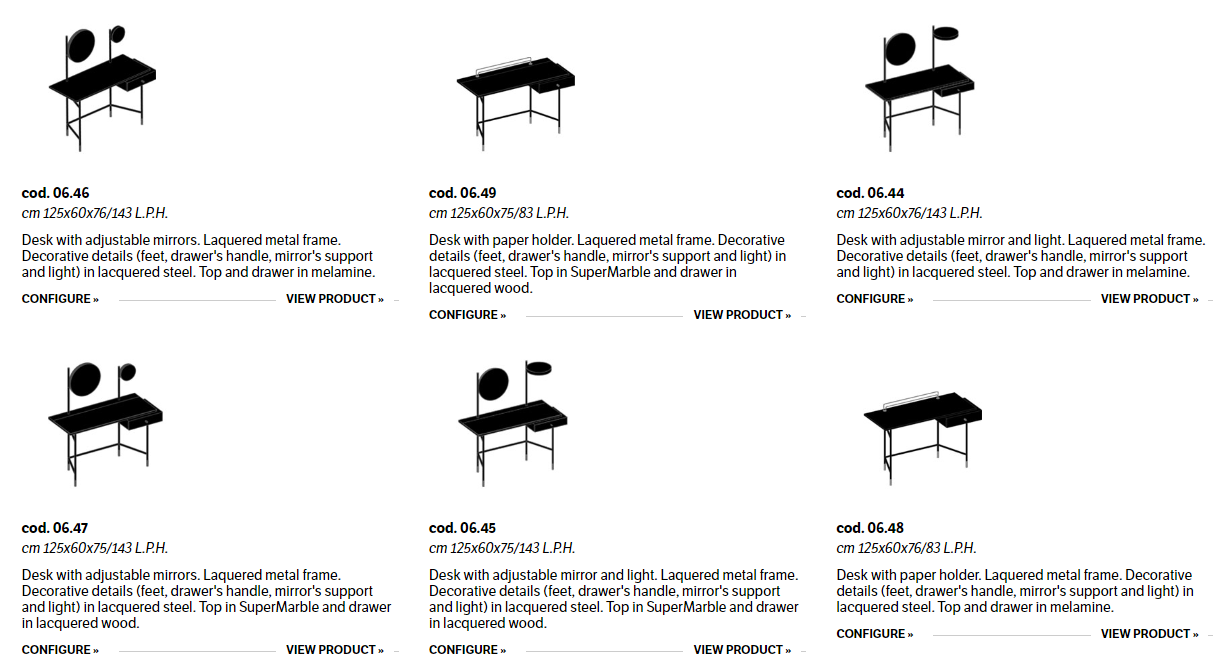 Desk with adjustable mirror and light, mirror only or desk only. Laquered metal frame. Decotaive details (feet, drawer's handle, mirror's support and light) in lacquered steel. Top and drawer in melamine.