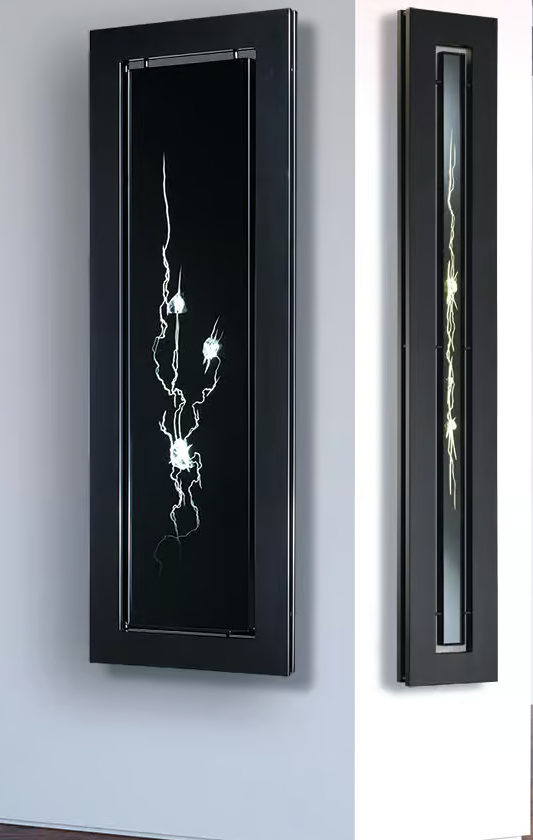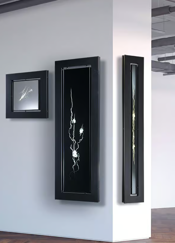 A large crystal mirror is crossed by a flash of red light. The black crystal is framed by the radiator. The artist proposes the radiator in black 9005.