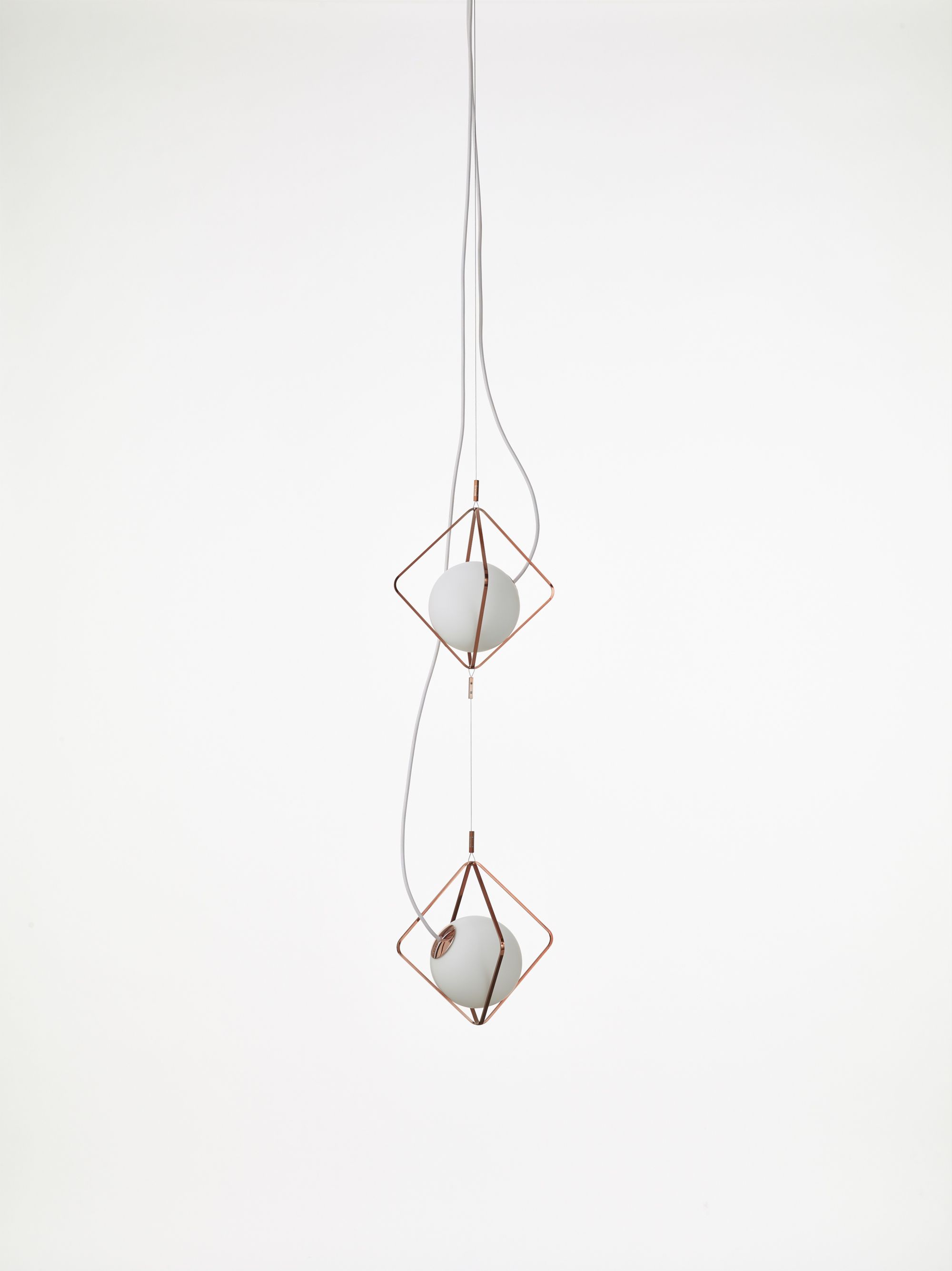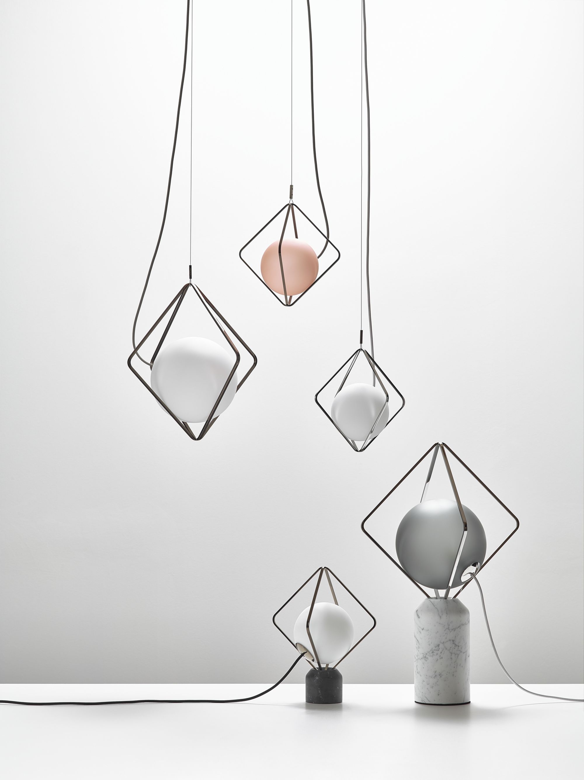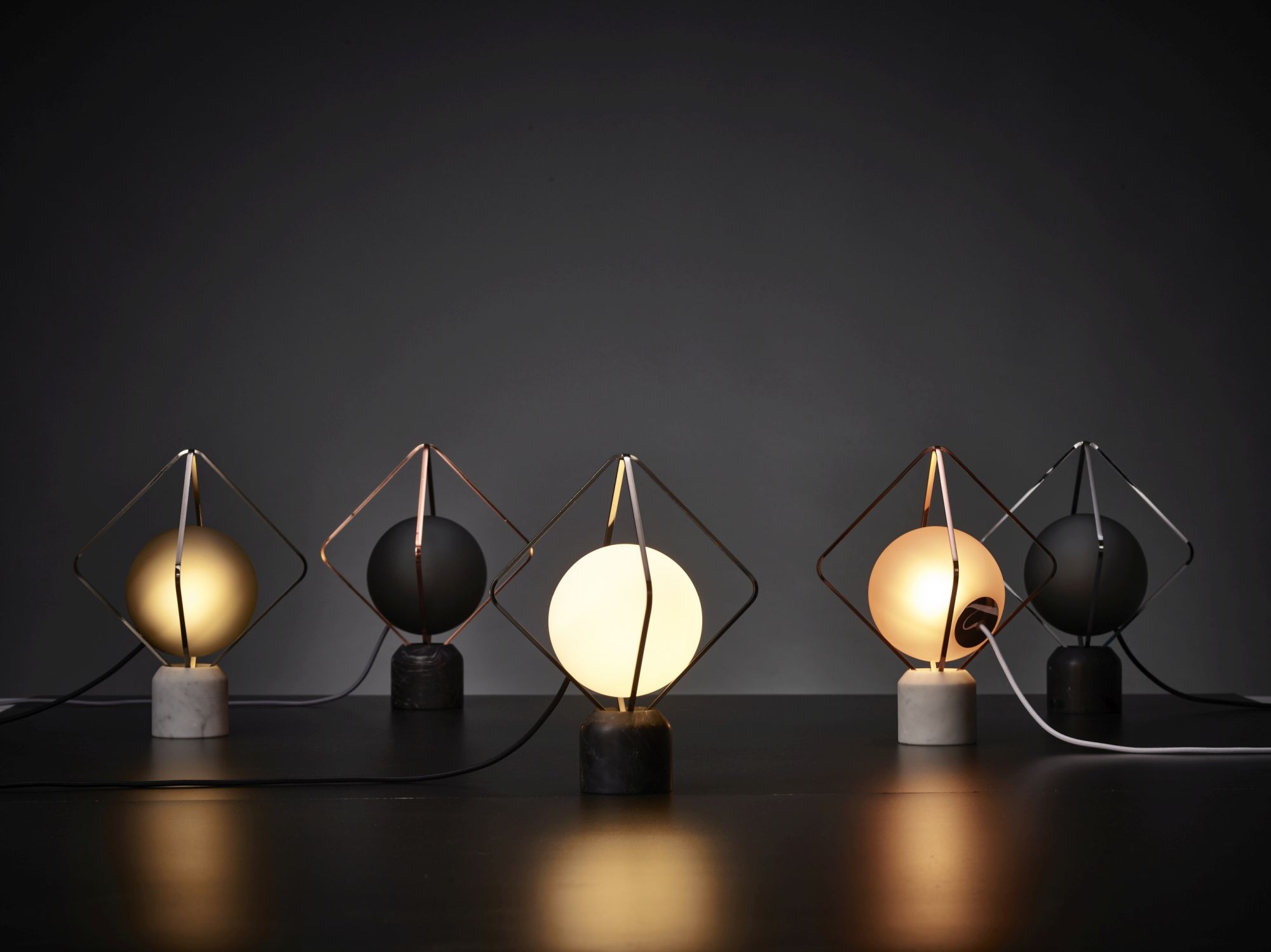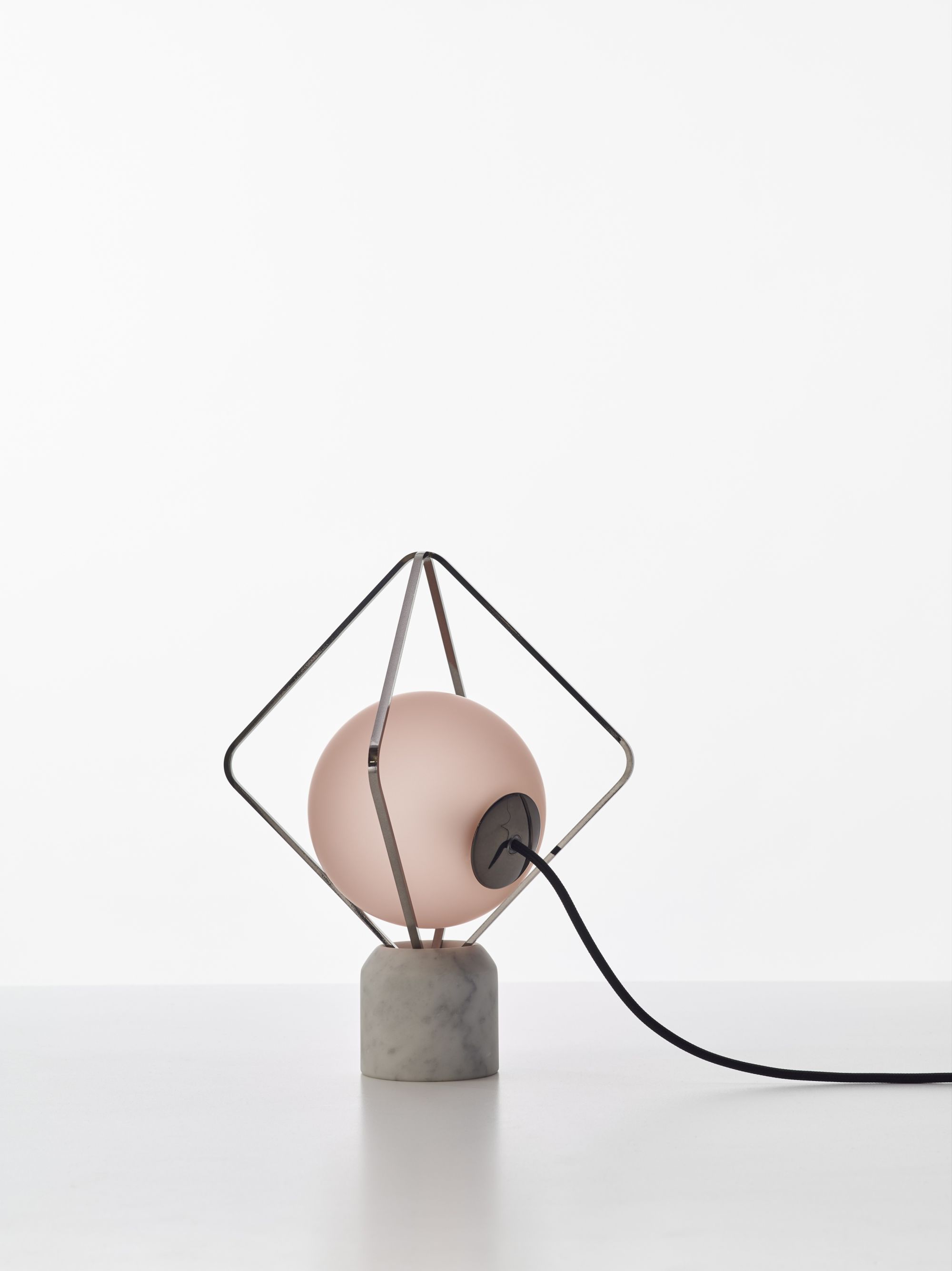 This modern lighting element with marble base, metal frames and a “pearl” placed inside, designed by Lucie Koldova, rounds out the variable Jack O’Lantern family. The new table version combines the beauty of handblown acid etched glass in smoke grey, light pink or triplex opal colours with marble base Carrara or Satinated nero marquinia, in frames with copper, chrome or chrome black liquid metal coating.
