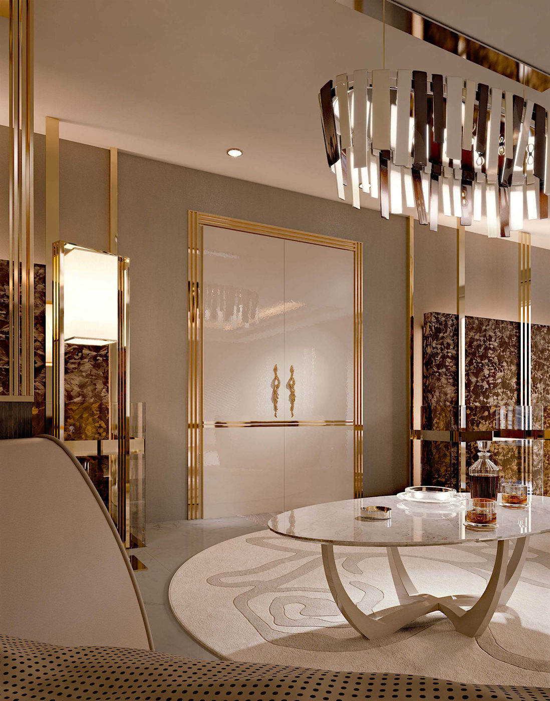 La preziosità degli arredi é accentuata dai riflessi dell’acciaio e dell’oro delle strutture, in perfetta sintonia con gli inserti dell’elegante “Rosa” del marchio Bizzotto Italia elegante dettaglio stilistico senza tempo.