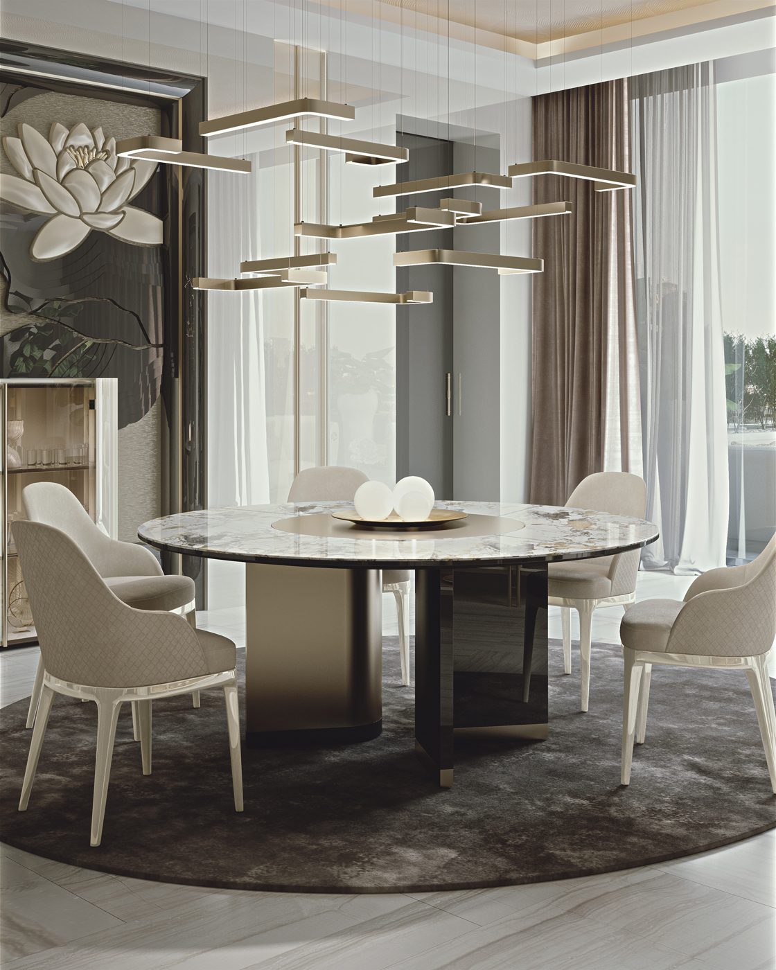 Imitano la leggerezza e la mutevolezza dell’aria le linee sottili e arrotondate della collezione Ikat, caratterizzata da una serie continua di contrasti: quelli tra volumi pieni e vuoti, tra superfici lucide e opache, tra elementi chiari e scuri.