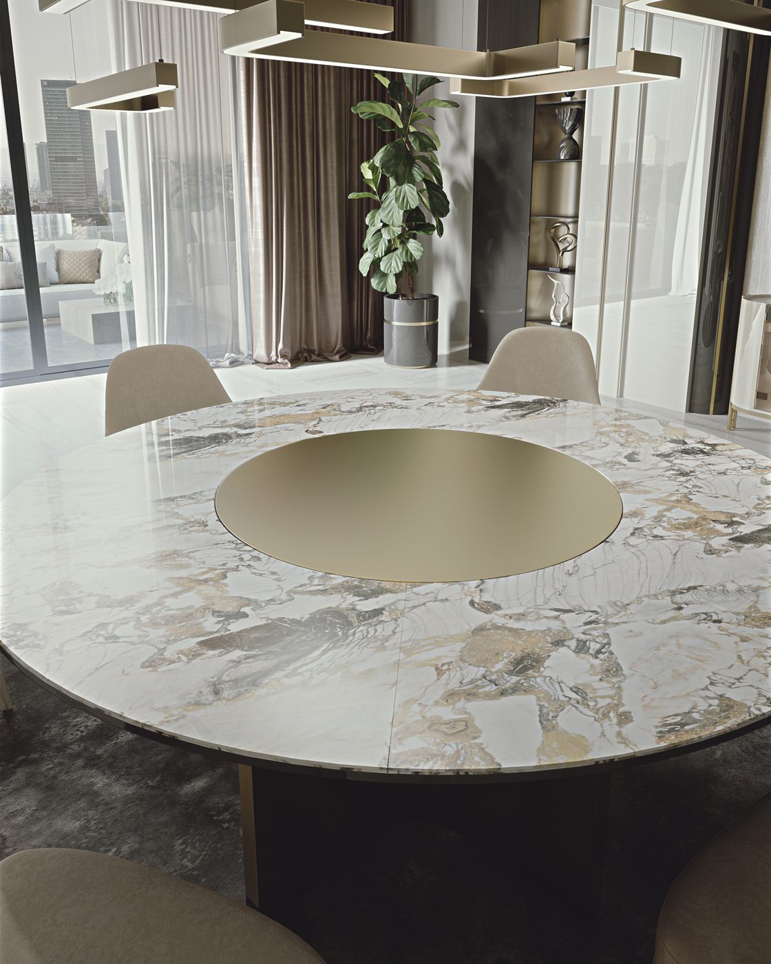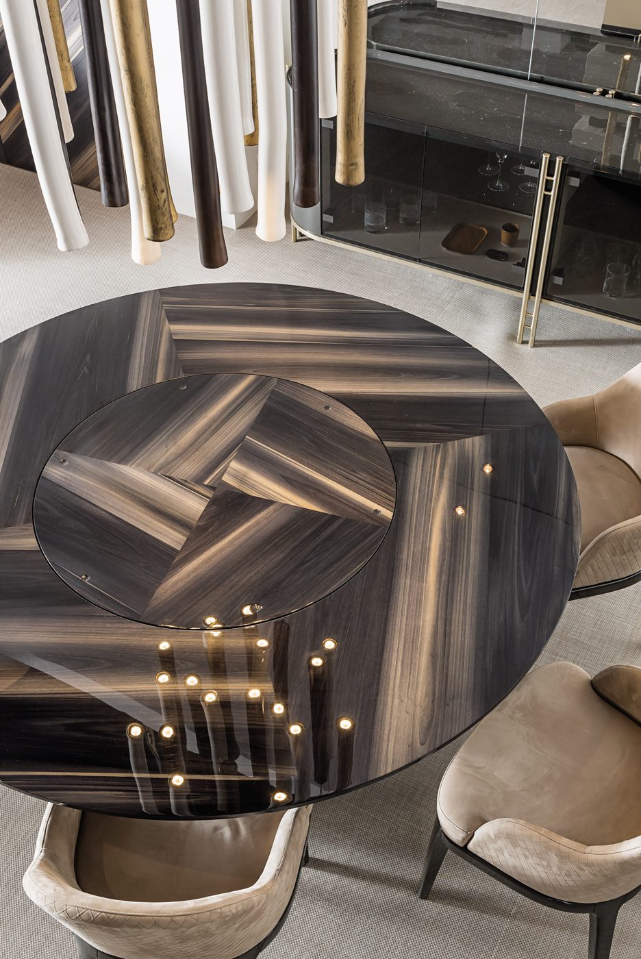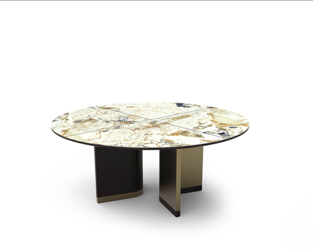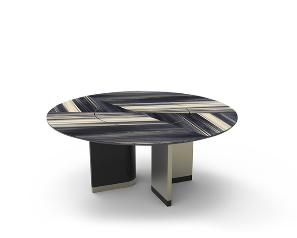 Le superfici possono essere così personalizzate con venature a vista dall’effetto fiammato, per una resa pittorica in contrasto con le forme simmetriche della collezione.