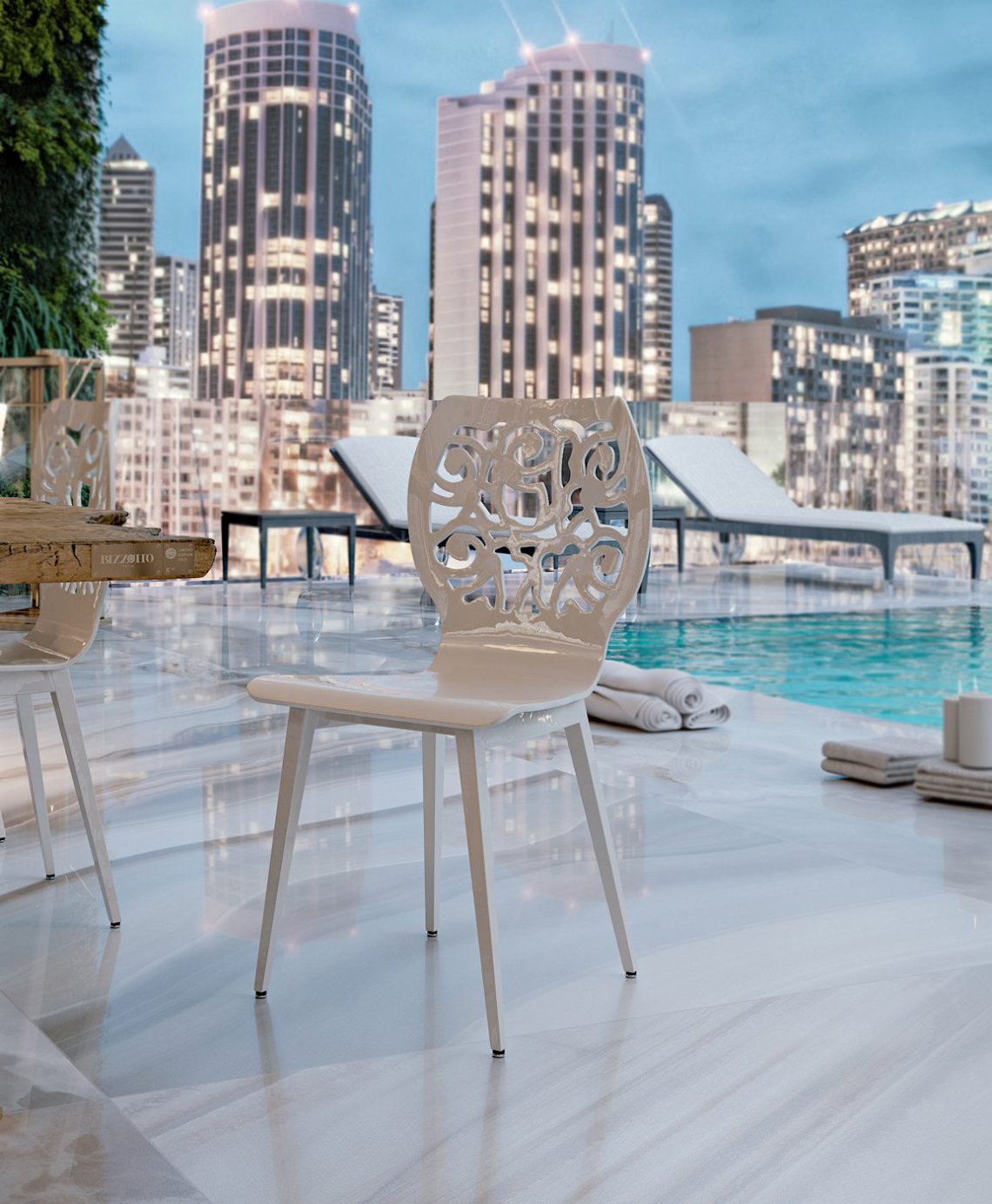 La preziosità degli arredi é accentuata dai riflessi dell’acciaio e dell’oro delle strutture, in perfetta sintonia con gli inserti dell’elegante “Rosa” del marchio Bizzotto Italia elegante dettaglio stilistico senza tempo.