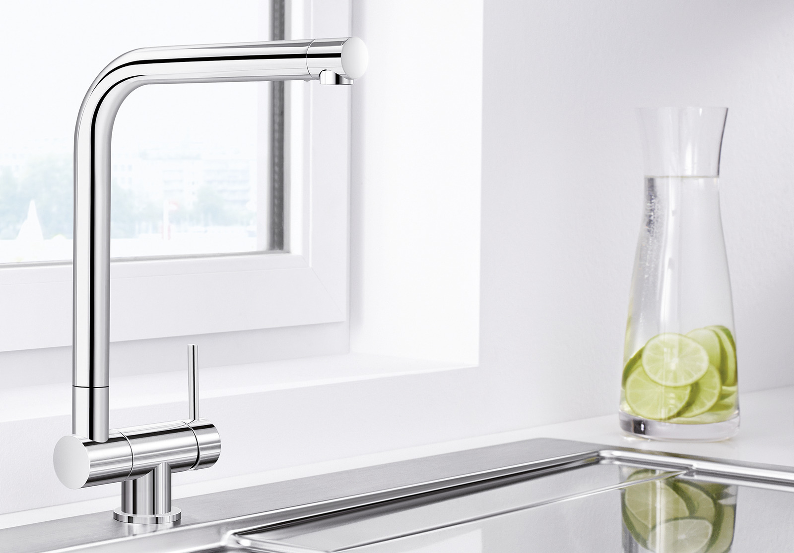 Modern mixer tap for in front of the window