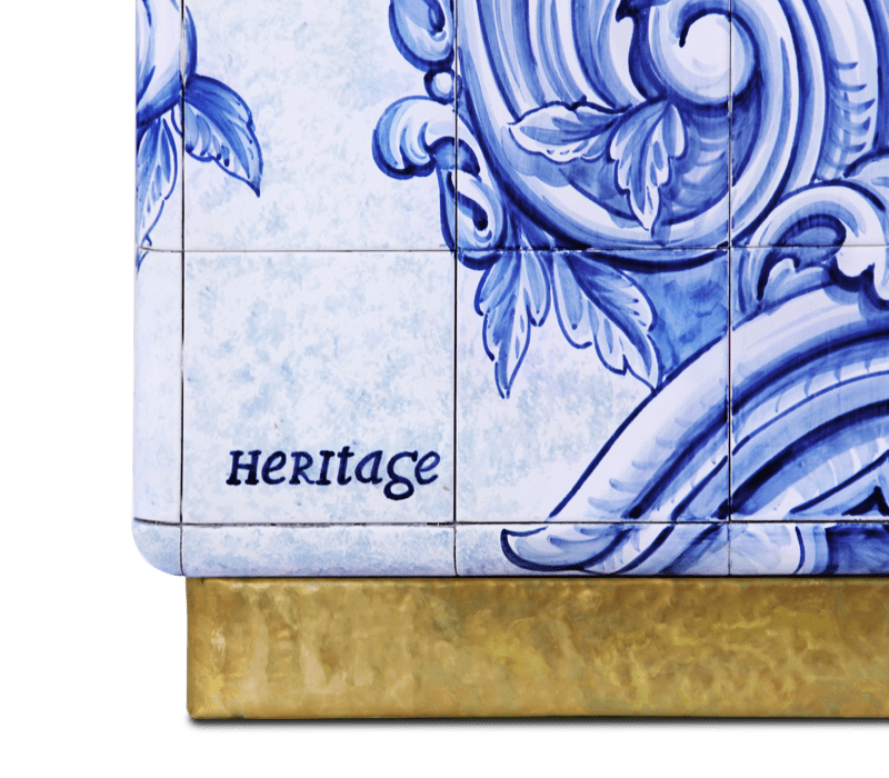 The Heritage Cabinet is a magnificent journey through Portuguese legacy. Covered in Azulejos, traditional hand painted tiles and one of the most representative art forms of Portuguese culture, the architectural cabinet portrays different scenes from the country’s Discoveries era. Centuries of history are gathered in a single final white and blue panel, and each layer is enhanced by vertical mirrors on the lateral surfaces. The hint of wander through the rich legacy continues when two door open to a lined glossy gold leaf interior, and a classical ornament trim reminds the inside of churches and rich buildings. A clear glass shelve can be seen on the two individual divisions of the cabinet. A statement cabinet, the Heritage can take center stage in the most elegant rooms since its back is also fully hand painted. A lengthy tradition of bespoke and exclusivity to make one-of-kind design pieces.