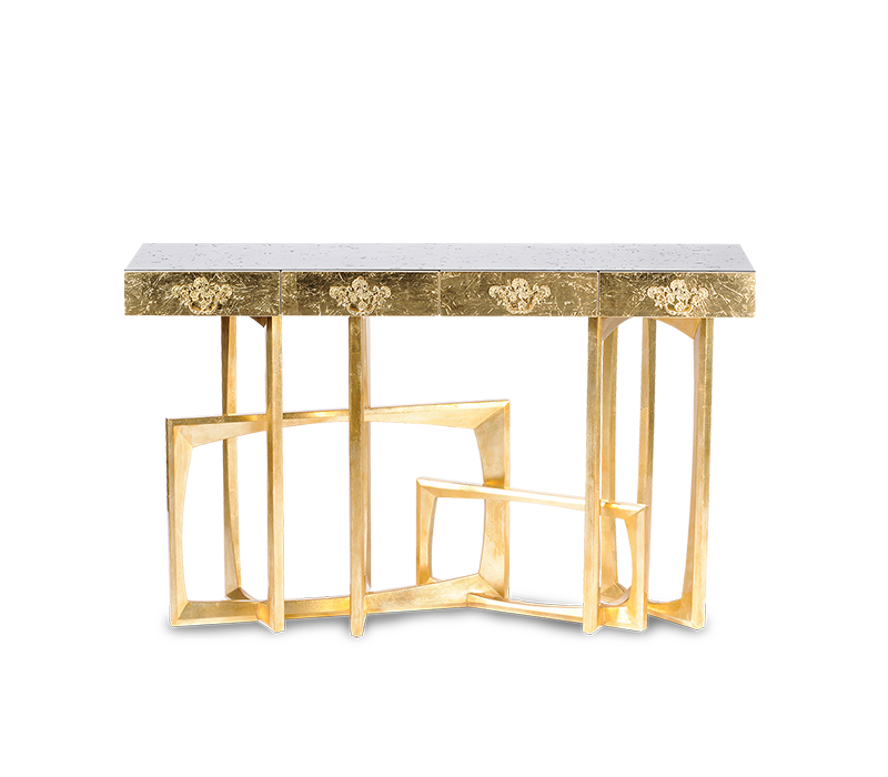 Metropolis console raises the level and expands the limits of design with a base of elegant composition and gracious lines. This exquisite table was designed to add a note of distinctive charm to a living room or a wide hall. Its base is handcrafted from mahogany and the top is framed in particleboard, which gives the black high gloss lacquer its texture appearance. There are four drawers with delicate brass handles. Metropolis is a modern console table available in either black or gold.