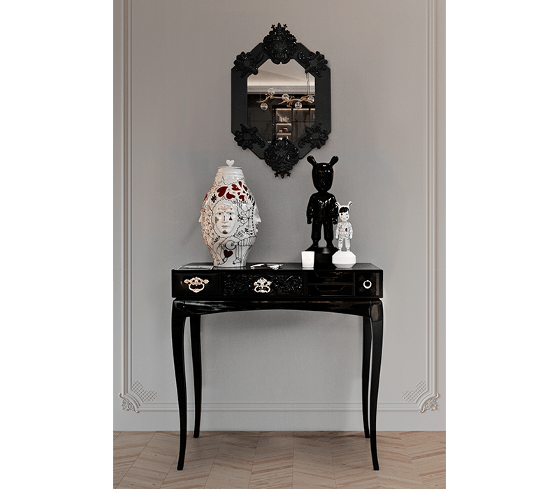 Soho is a modern console created as a tribute to Soho Sideboard. This design piece presents a collection of wood drawers with mirror and black glass.