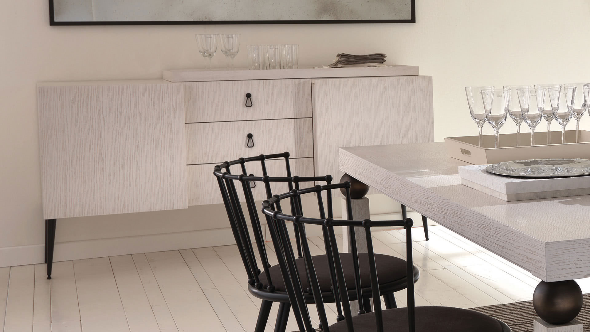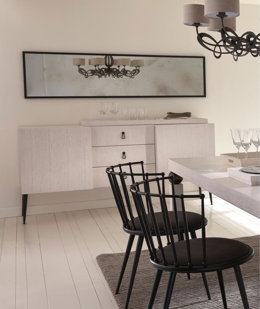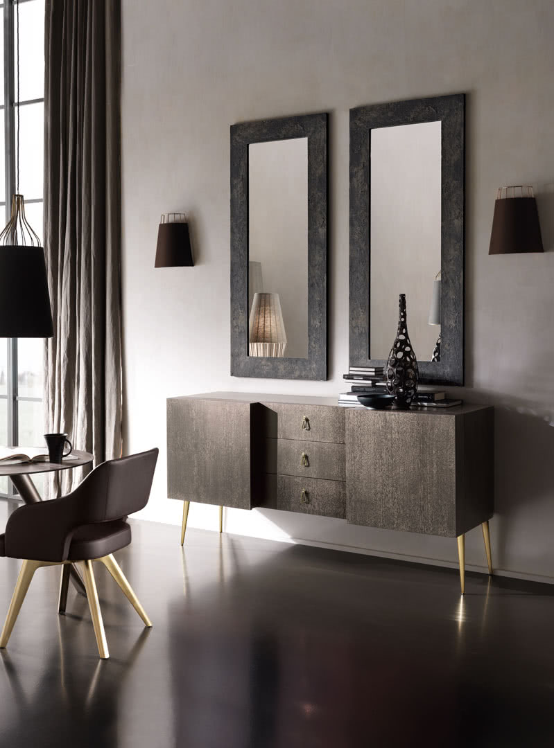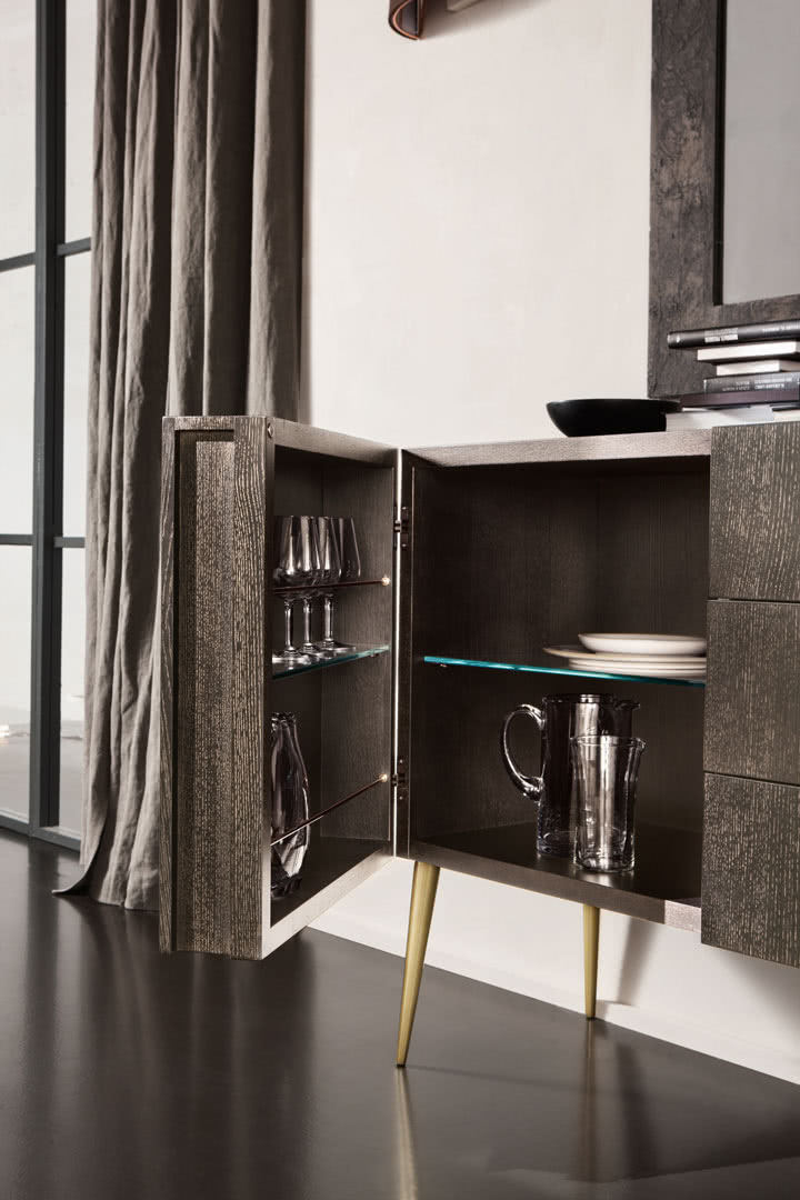 Il vano interno è diviso con ripiani in vetro a filo lucido mentre le ante presentano internamente dei portabottiglie-bicchieri con astine di protezione in tondino di acciaio. La struttura è in legno multistrato impiallacciato di rovere a poro aperto con spazzolatura patinata a contrasto e decorazione realizzata completamente a mano con otto passaggi di finitura. I piedi sono in metallo conificato a freddo, piastre tagliate a laser, con saldatura a ottone e levigatura realizzate a mano. Le maniglie in ottone pantografate con finitura a bagno di galvanica (spessore minimo 25 μm).
