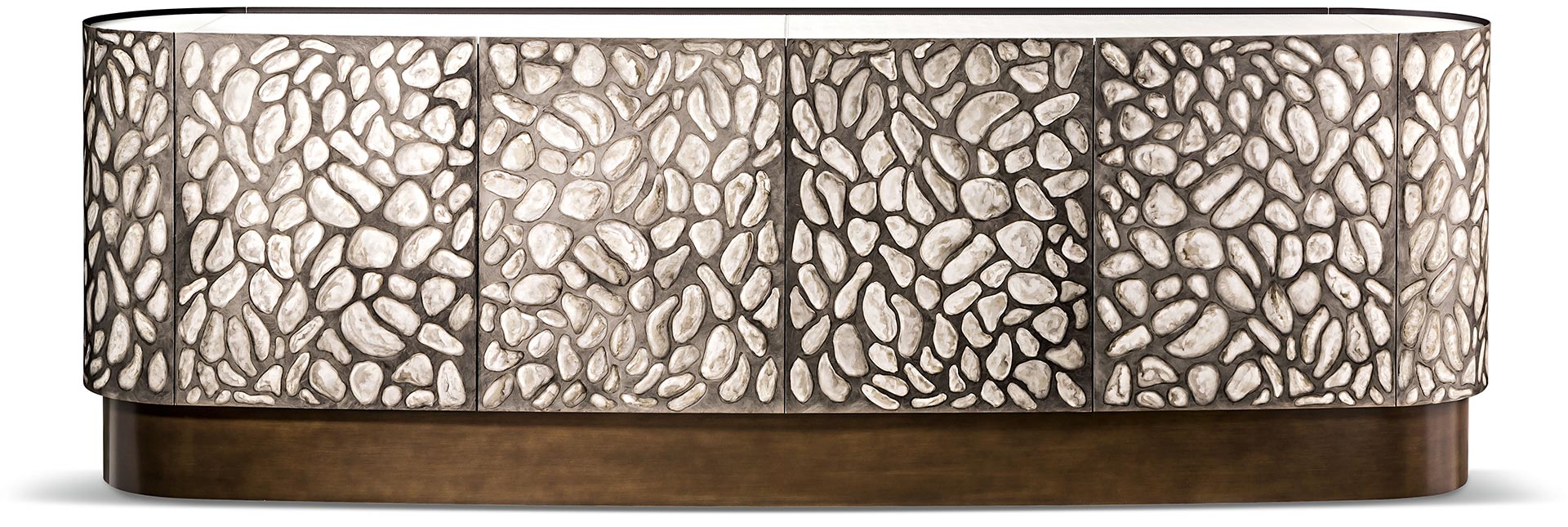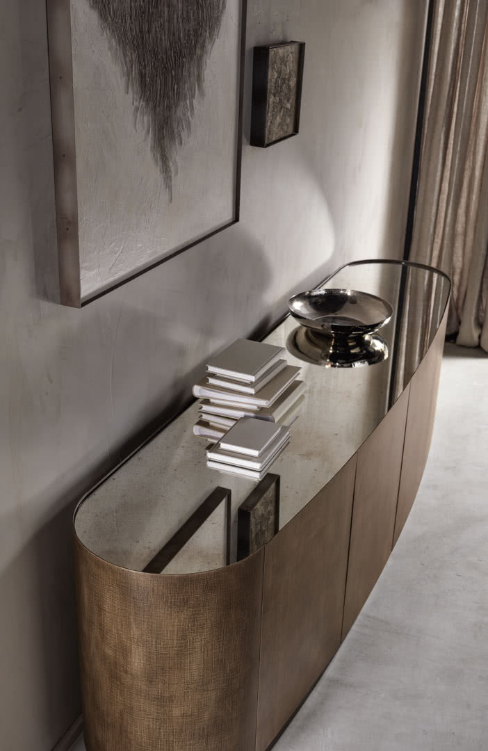 Internamente è suddivisa da ripiani in vetro a filo lucido. Il top è in specchio fumé bronzo mentre i fianchi e le ante sono realizzate in metallo 2,5 mm tagliato a laser e curvato. La base è in ferro pieno curvato. Tutte le saldature sono a filo e a ottone interamente levigate a mano. Una linea essenziale dove risaltano le decorazioni Cantori, dal Seashell per un arredo classico al Decorato Tela, che lo adatta ad un ambiente dal design moderno.