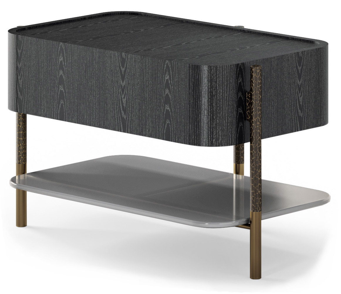 La struttura è in frassino nero con richiamo frenato e un elegante piano in vetro utile come appoggio. Gli interni laccati avorio contribuiscono a creare un armonioso complemento d’arredo. Le strutture verticali di sostegno lo seguono da terra per tutta la sua altezza racchiudendolo e sostenendolo come un ideale cavalletto in metallo forgiato finito ottone brunito. Il suo design unico lo rende perfetto come comodino per la zona notte.