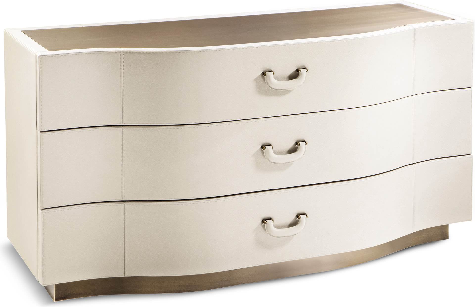Il piano è sagomato e la base è realizzata in bronzo. Le maniglie dal sapore vintage, che ricordano le valige di lusso, sono rivestite in pelle con dettagli in metallo. Le forme sinuose e armoniose, insieme alla ricercatezza dei materiali e all'abbinamento con i comodini, creano un gruppo notte elegante e unico.