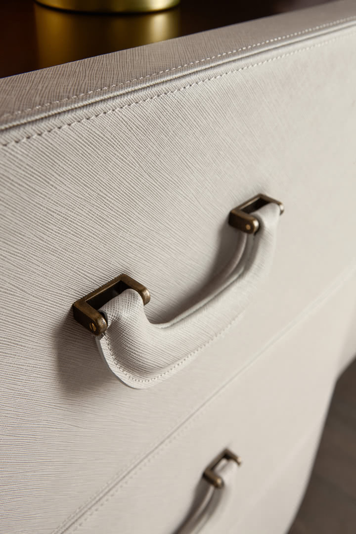 Comò/cassettiera classico Valentino rivestito in pelle.