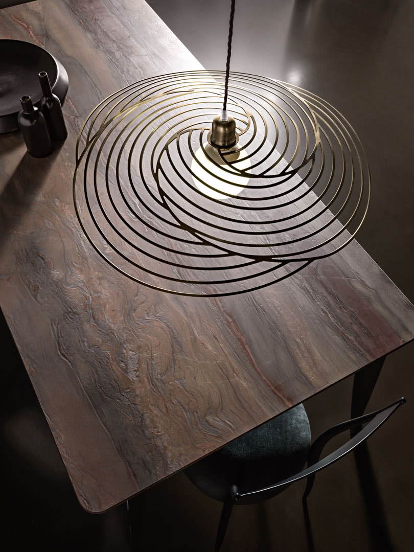 I piedi in metallo, modellati e levigati manualmente, sono schiacciati alla base in modo da slanciare e alleggerire il piano in marmo o in ceramica. Linee e materiali moderni per un tavolo dal design lineare.