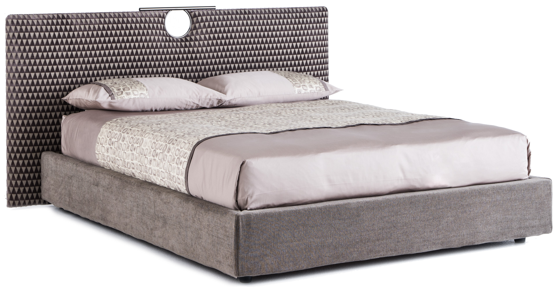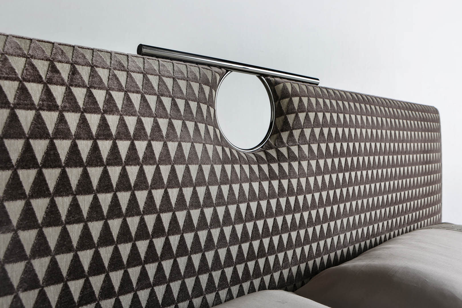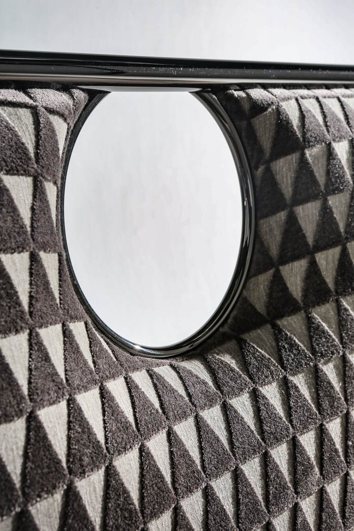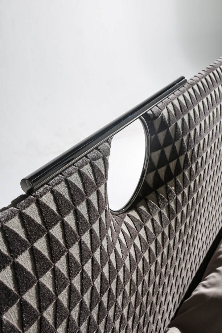 Il dettaglio in metallo spezza la semplicità del letto imbottito rendendolo più elegante; la testata e il giroletto sono imbottiti e rivestiti, o impunturati se in pelle, anche in tessuto/pelle fornito dal cliente (il giroletto è sfoderabile). Il letto Bay, con la linearità del design, dona un carattere unico alla camera da letto moderna; è disponibile in varie dimensioni per reti da cm: 160x200 (letto matrimoniale), 180x200 (letto matrimoniale) e 200x200 (letto king size) anche nella versione con box contenitore.