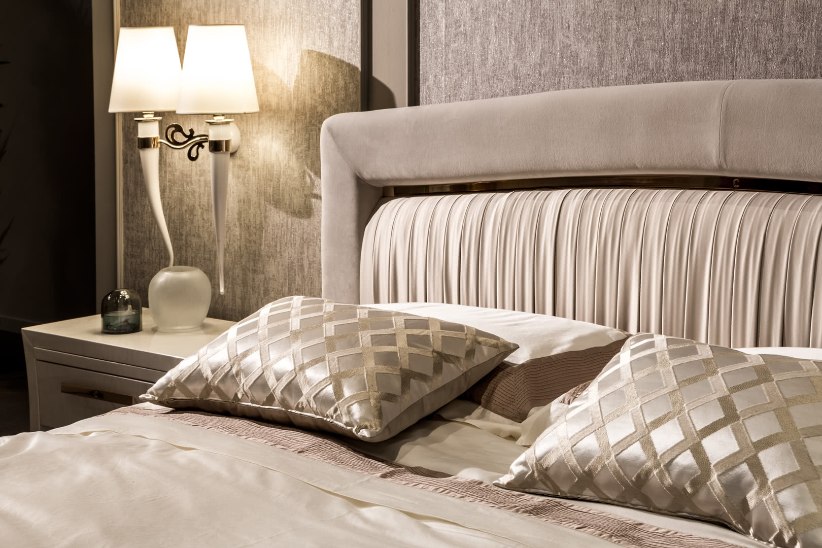 Letto matrimoniale classico Portofino Plissè imbottito con dettagli in oro.