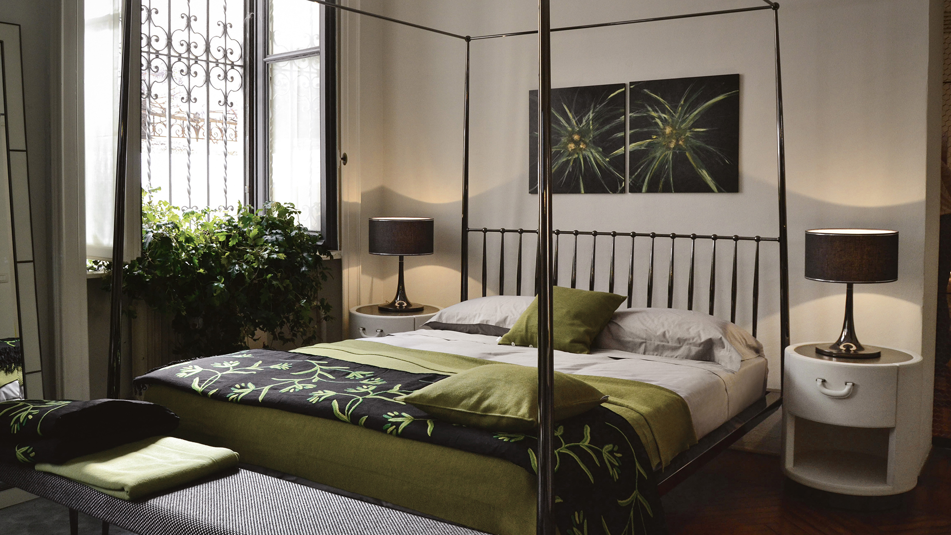 Il piano è sagomato e la base è realizzata in bronzo. La maniglia dal sapore vintage, che ricorda le valige di lusso, è rivestita in pelle con dettagli in metallo. Le forme sinuose e armoniose, insieme alla ricercatezza dei materiali e all'abbinamento con il comò, creano un gruppo notte elegante e unico.
