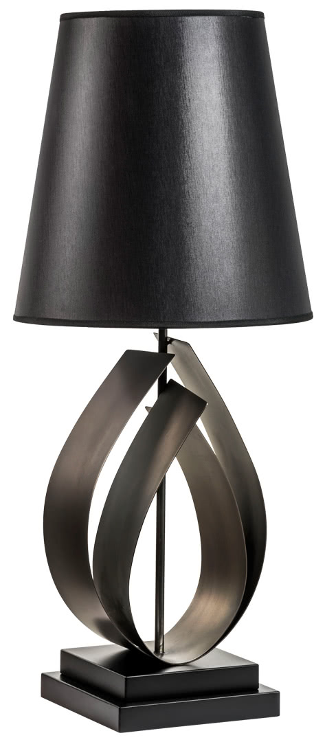 Un paralume in tessuto su una lampada, fatta da un foglio di acciaio curvato, in apparenza fluido ma solido e stabile al tatto. L’uso della finitura bronzo fa nascere luminosi e delicati riflessi che si accentuano con la luce accesa. Un design moderno che rende questa lampada/scultura adatta ad ogni ambiente e ad un gusto internazionale, classico o moderno.