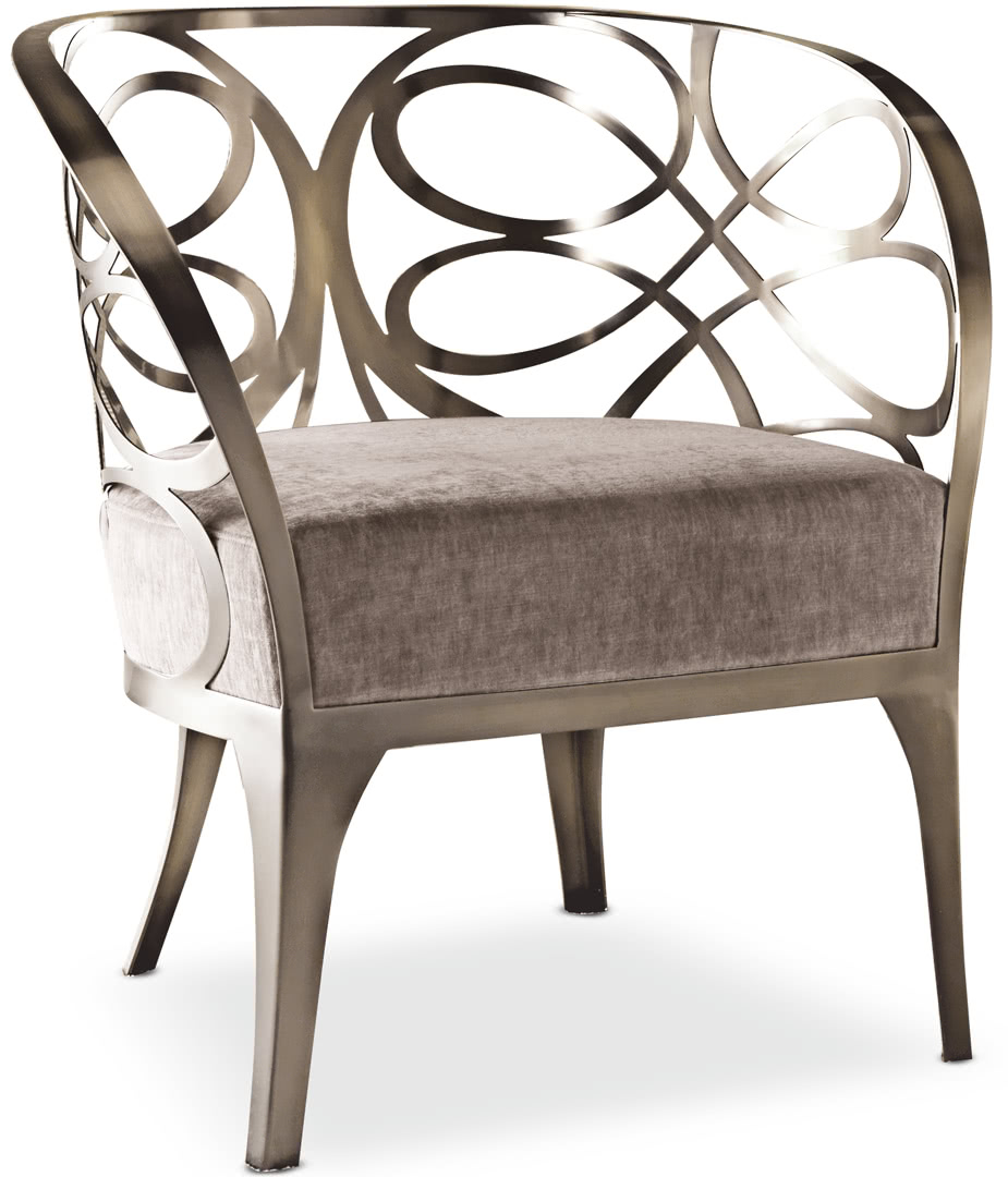 La base e lo schienale sono realizzate in ferro pieno, curvato e tagliato a laser per formare un disegno a ghirigori dalle forme sinuose e dal sapore classico. La seduta in legno è imbottita in gomma a due densità e rivestita sartorialmente in tessuto, velluto, pelle o con un tessuto fornito dal cliente (sfoderabile).