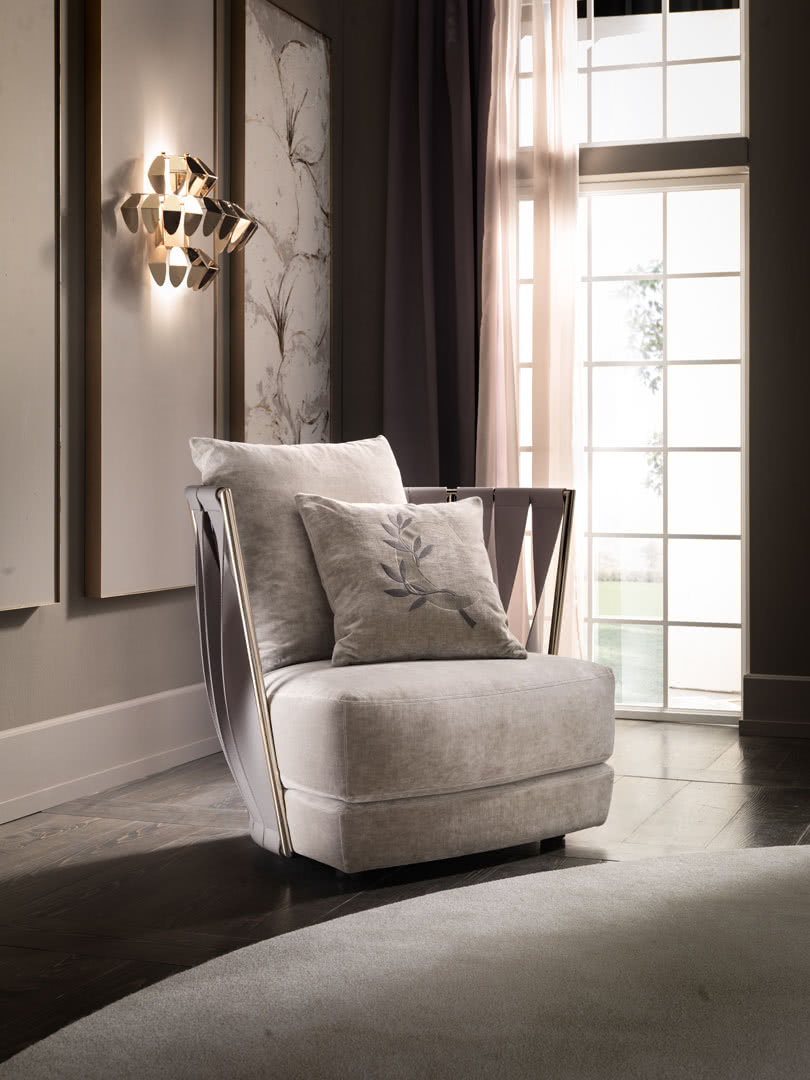 Poltrona moderna di design Twist con schienale a fasce in pelle o ecopelle.