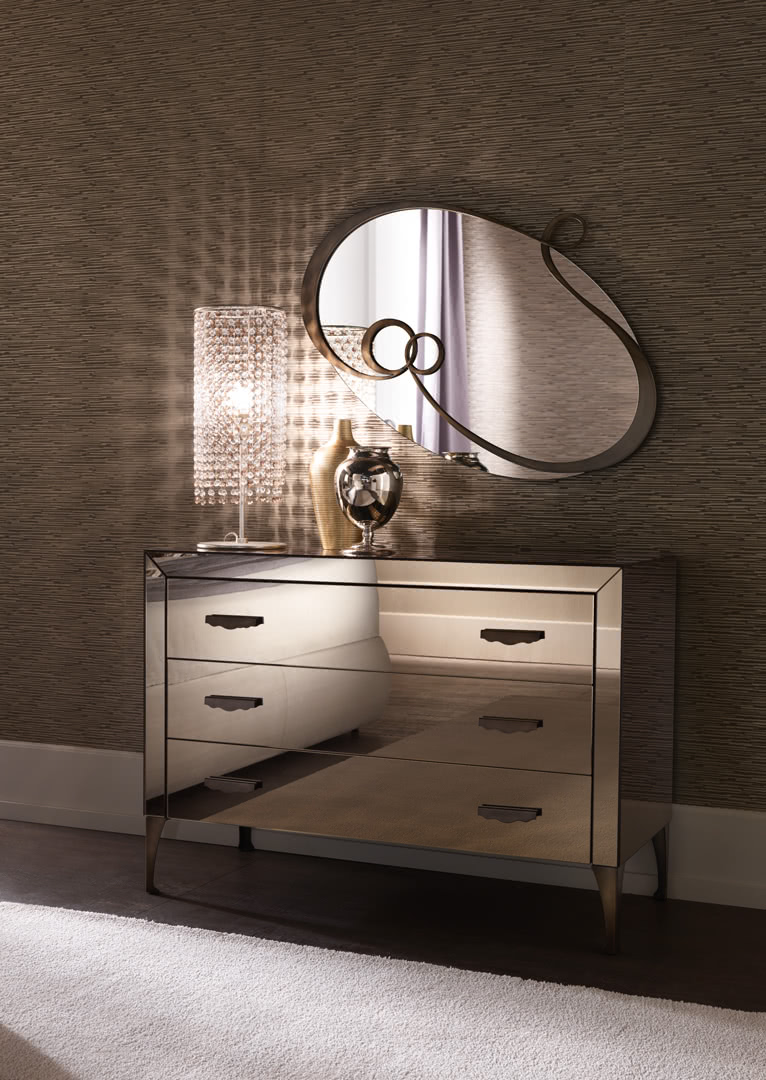 Lo specchio è argentato a doppio fondo e molato; i particolari sono tagliati a laser e bombati a freddo, con levigatura e decorazione artigianale in foglia. Il sistema di aggancio è regolabile, per consentire di appendere la specchiera con l’inclinazione che si desidera.