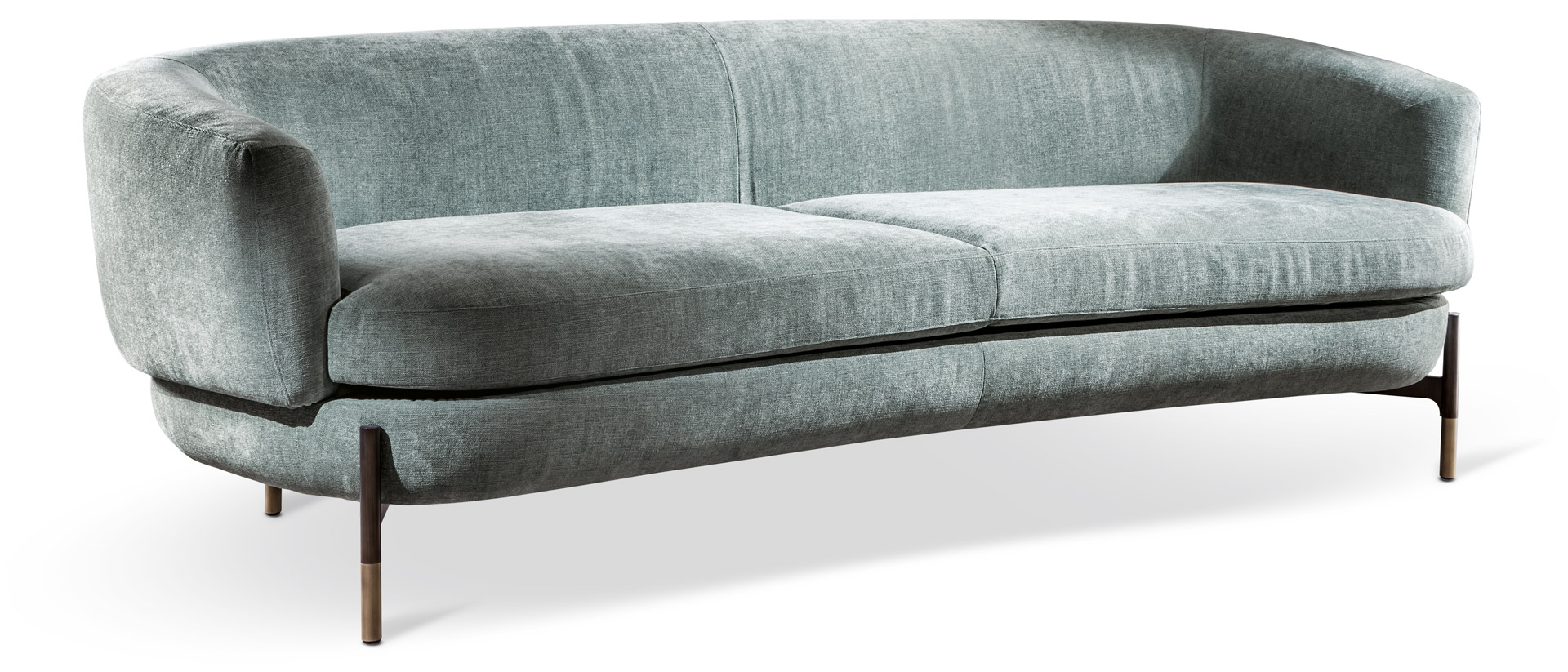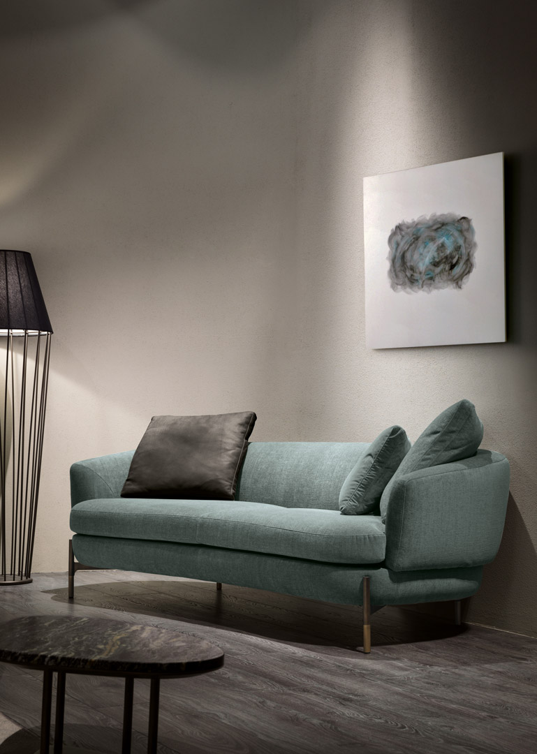 La struttura è in legno massello in faggio e pioppo con inserti in multistrato, il molleggio è garantito da cinghia elastiche indeformabili. Il rivestimento strutturale è in poliuretano espanso a quote differenziate ad alta densità e lo strato superiore ad alta componente elastica, la cuscinatura è a densità differenziata indeformabile in piuma e falda sintetica. I piedi dal design minimal sono in ferro pieno e sostengono la seduta con leggerezza. Un divano lineare dall’aura vintage, pulita e senza tempo, che rende accogliente l’intero living da solo o in coppia.