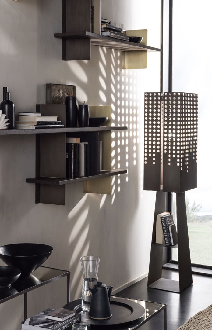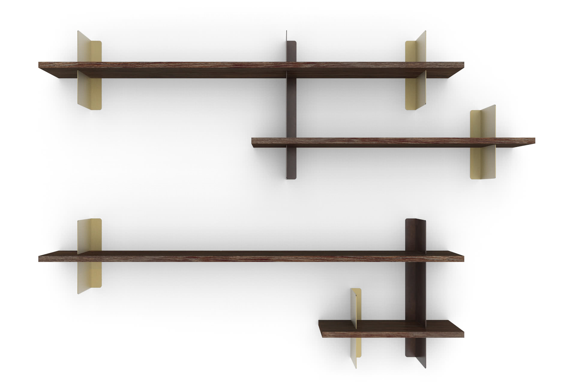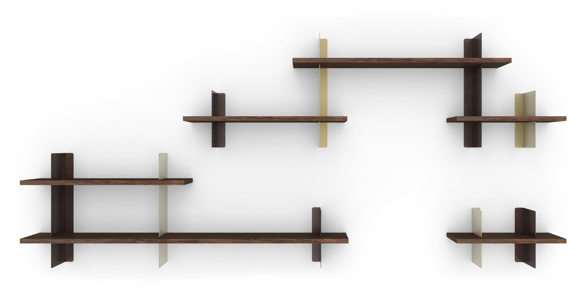Sistema di libreria componibile, da appendere a parete, formata da mensole in legno massello, disponibili in quattro diverse lunghezze, e supporti con uno o due vani per ripiani, realizzabili in ottone spazzolato o ferro patinato. Finiture ricercate e materiali forti per una libreria che diventa un disegno grafico decorativo.