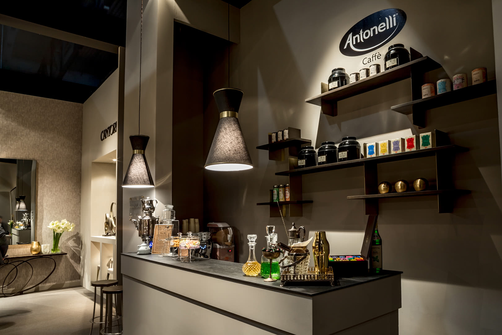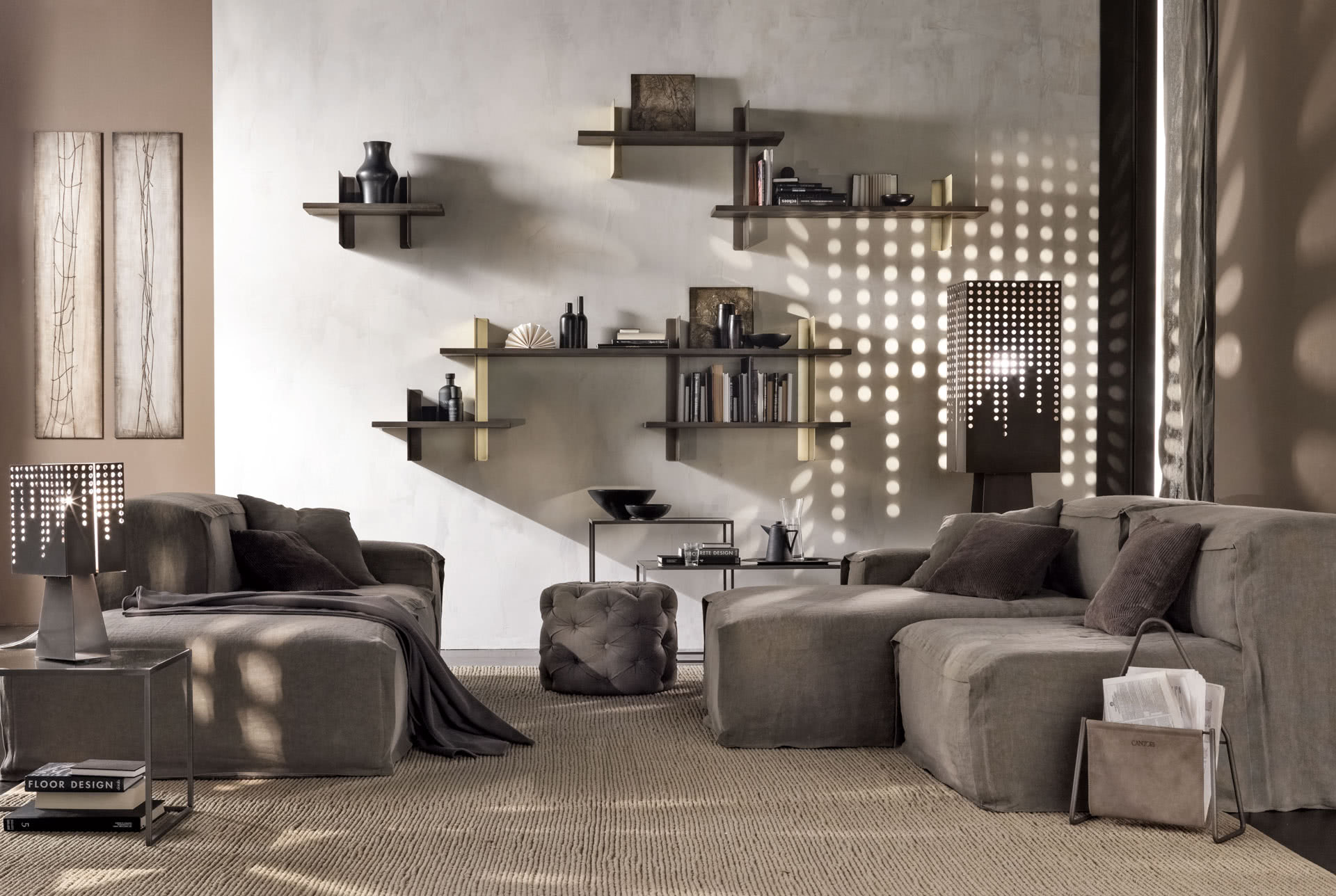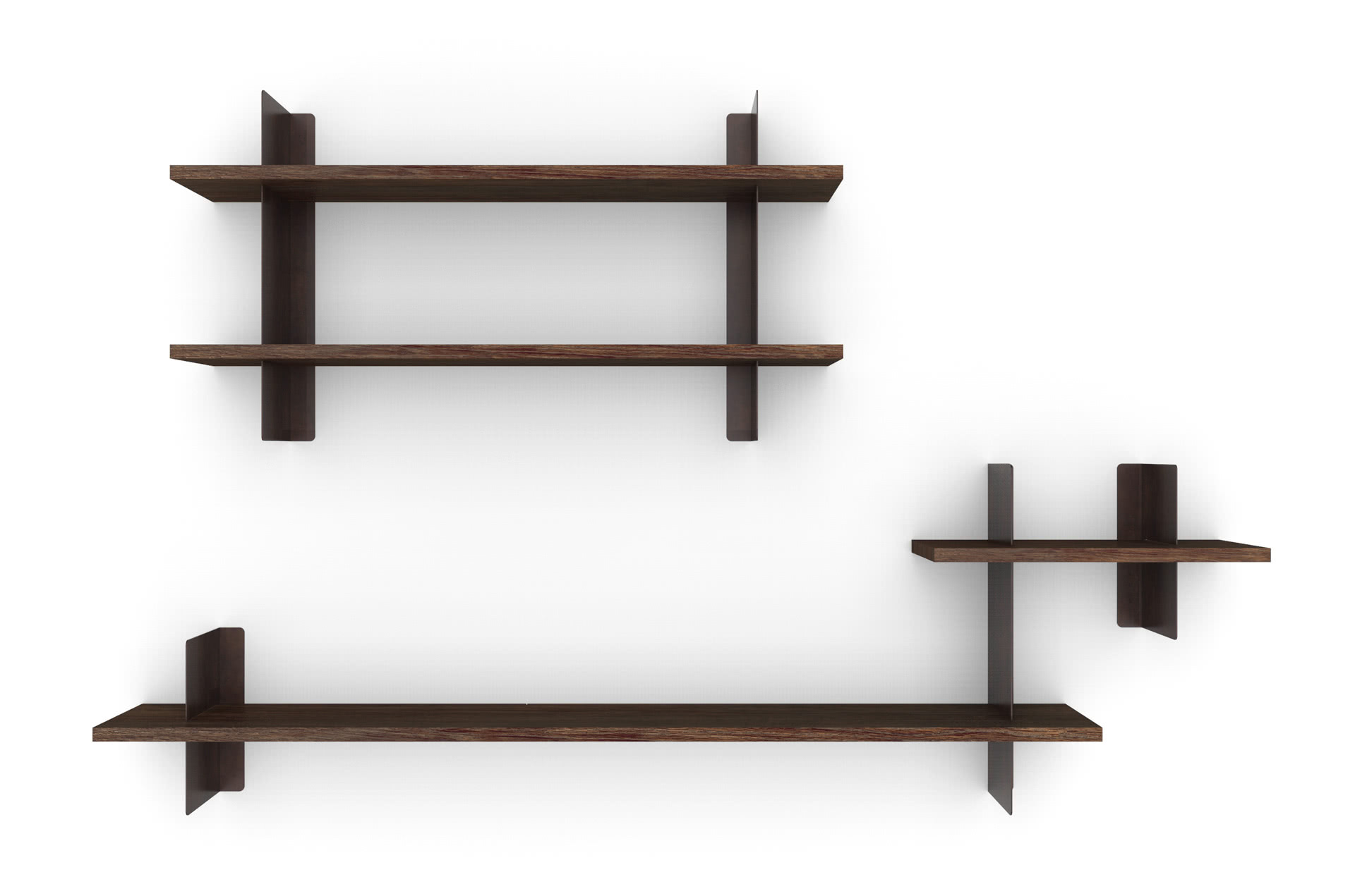 Sistema di libreria componibile, da appendere a parete, formata da mensole in legno massello, disponibili in quattro diverse lunghezze, e supporti con uno o due vani per ripiani, realizzabili in ottone spazzolato o ferro patinato. Finiture ricercate e materiali forti per una libreria che diventa un disegno grafico decorativo.