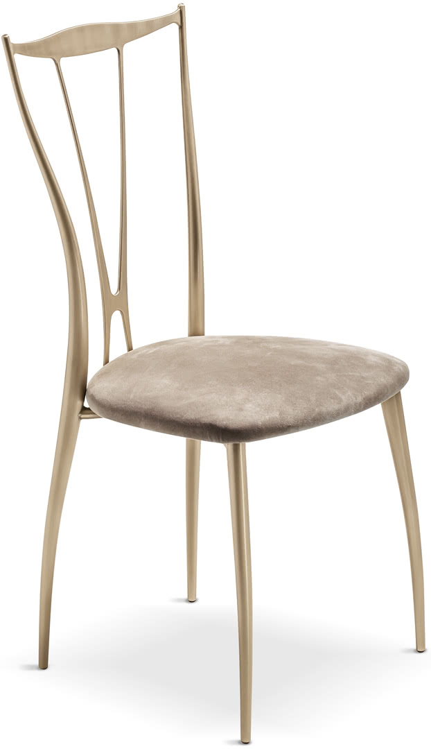 Nel dettaglio la struttura è in ferro conificato e sagomato a freddo, mentre lo schienale è tagliato a laser e curvato. La seduta in legno sagomato, è imbottito in gomma a due densità e rivestito sartorialmente in tessuto sfoderabile o in pelle/ecopelle non sfoderabile. Le sedie Vilma New si vestono d’oro per impreziosire i momenti di festa.