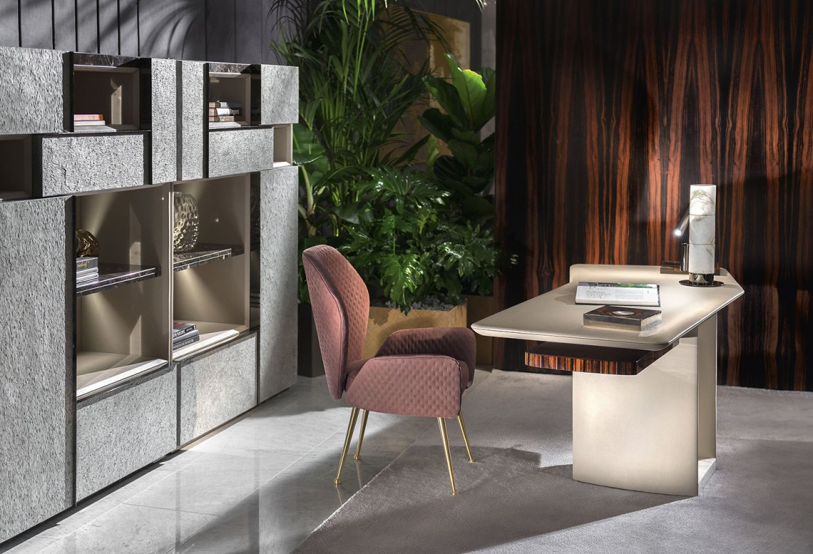 Eclipse writing desk expresses great harmony thanks to its refined lines. The structure presents an unusal design in terms of construction and materials used: two elliptical legs upholstered with leather support an upholstered elegant top while, on the sides of the structure are assembled one shelf on the right and a drawer on the left in ebony wood. Marble table lamp Yale matches really well with this writing desk.