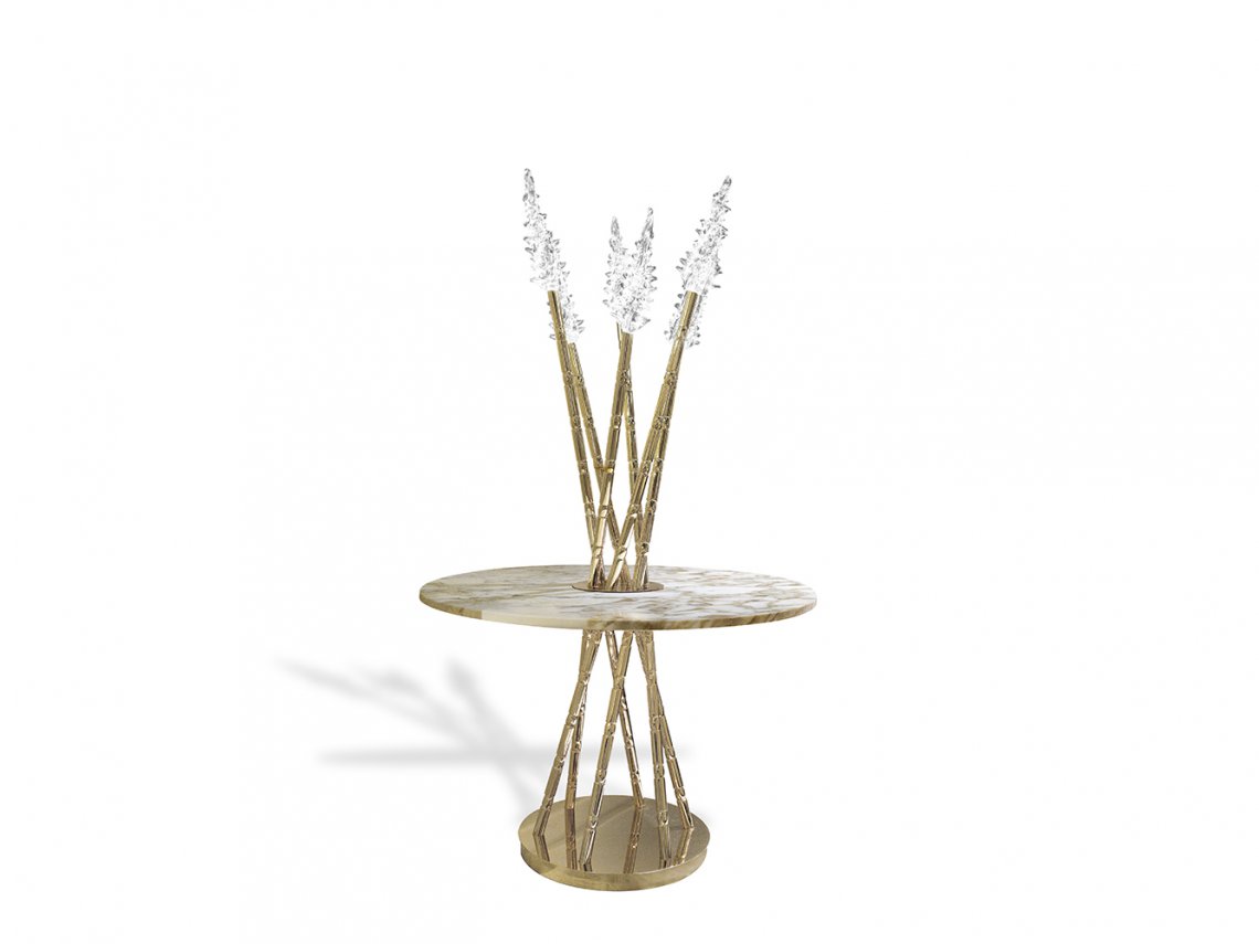 In Lewis side table a bundle of metal pipes that ends up with handmade glass points crosses a precious marble top: the glass points, realized by master glassmakers in Venice area, are enlightened by leds placed inside of metal pipes. More than a piece of furniture this exclusive element is able to enhance a great atmosphere in a refined and elegant environment.