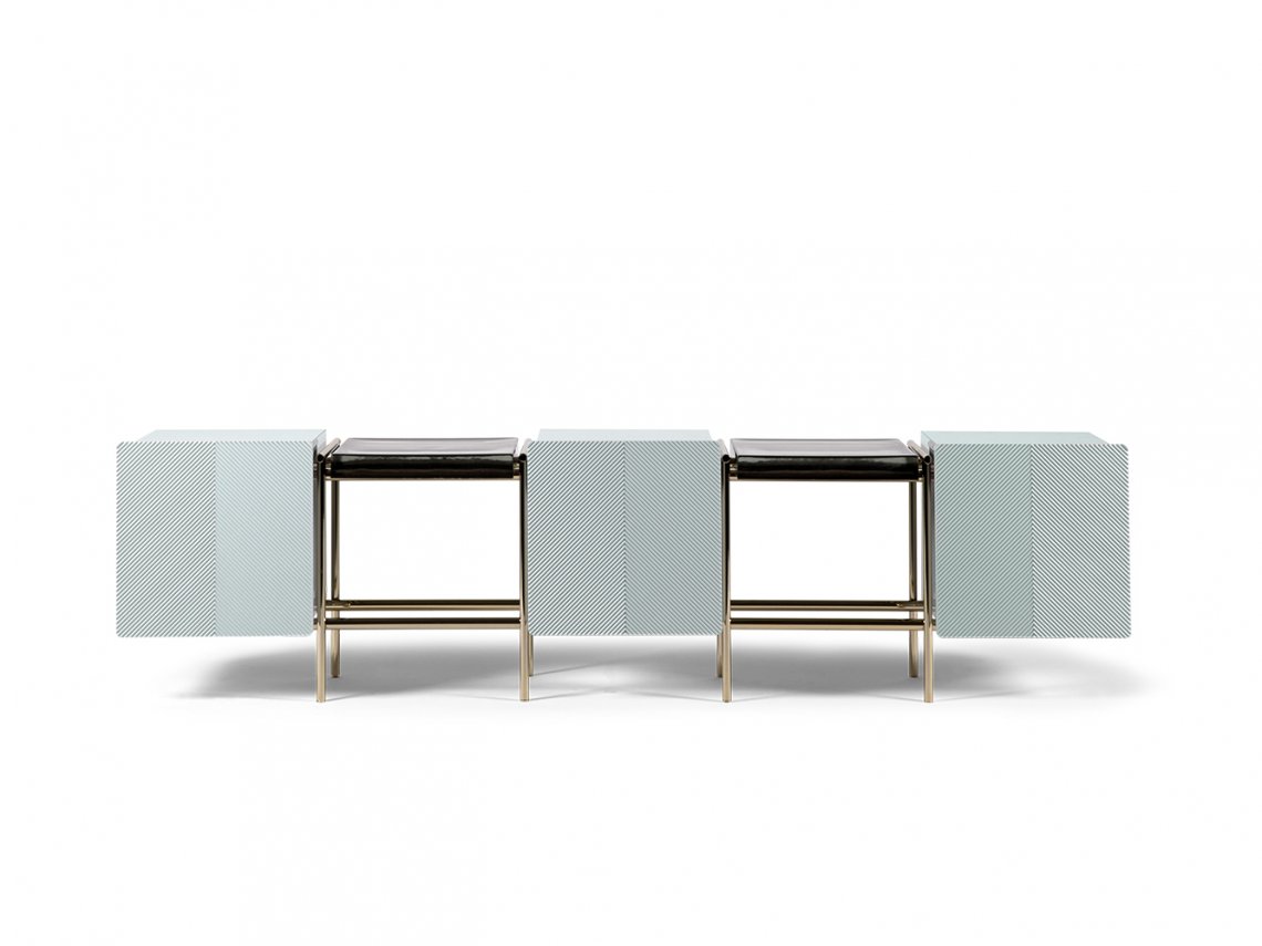 The storage unit Libra is a twist of gold finish metal pipes supporting storage elements and artistic glass shelves. The high craftsmanship emerges from the artistic glass obtained through the casting in plate technique realized by the Master glassmakers of Venice area. The inspiration of storage unit Libra comes from the typical structure of “trabucchi”, small wooden constructions built along the East coast of Italy and used for fishing.