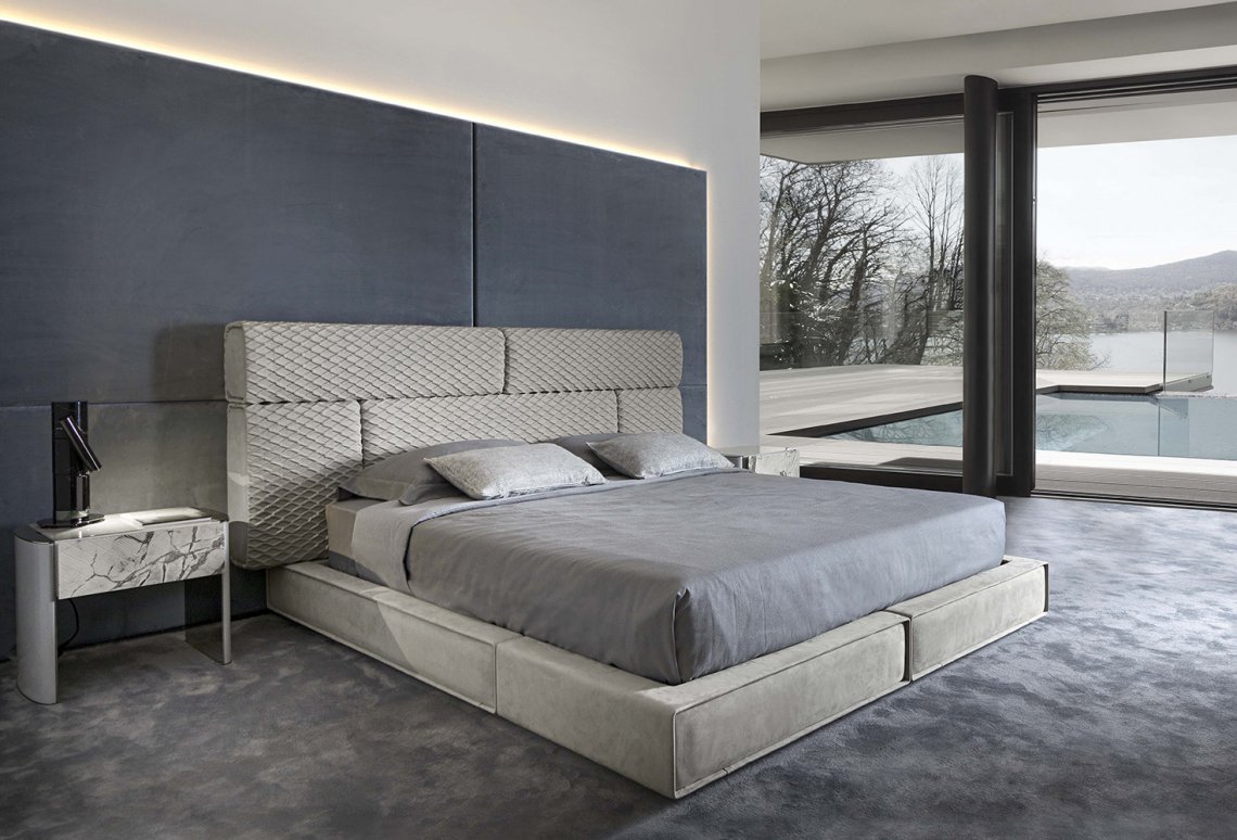 Bed Hug is characterized by a headboard decorated with soft three-dimensional quiltings with rhomboid pattern that underline great sartorial skills. It is available both in leather and fabric upholstery.