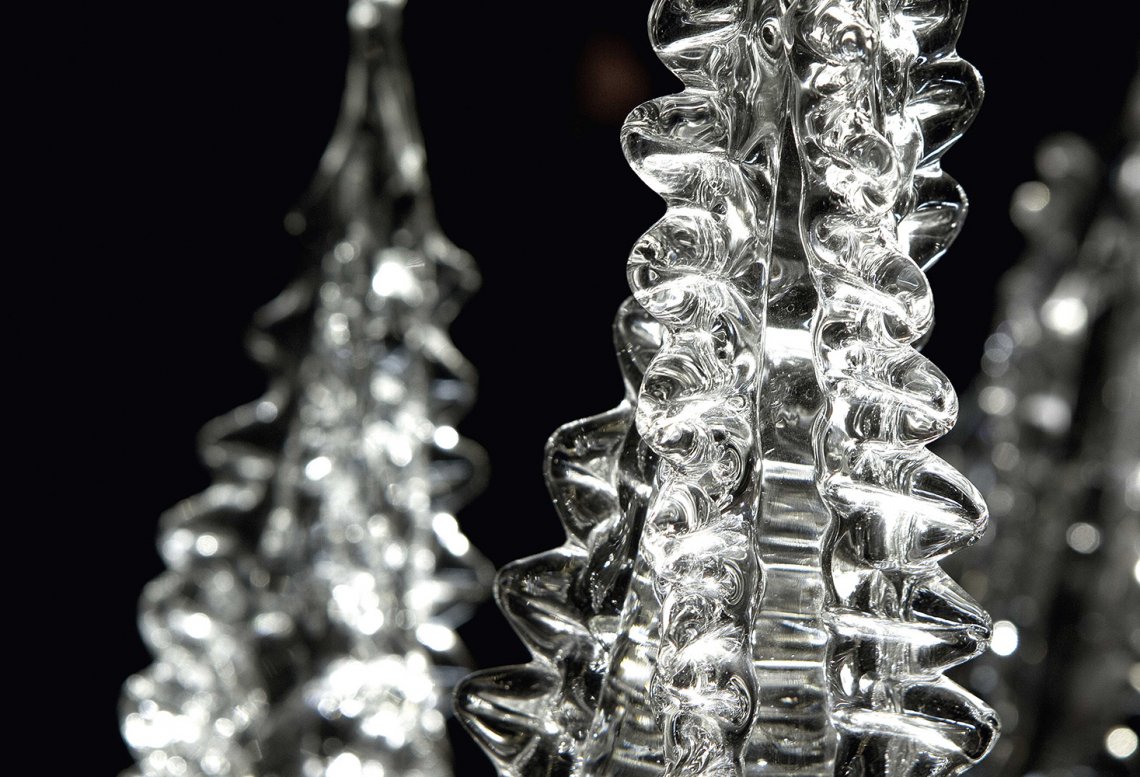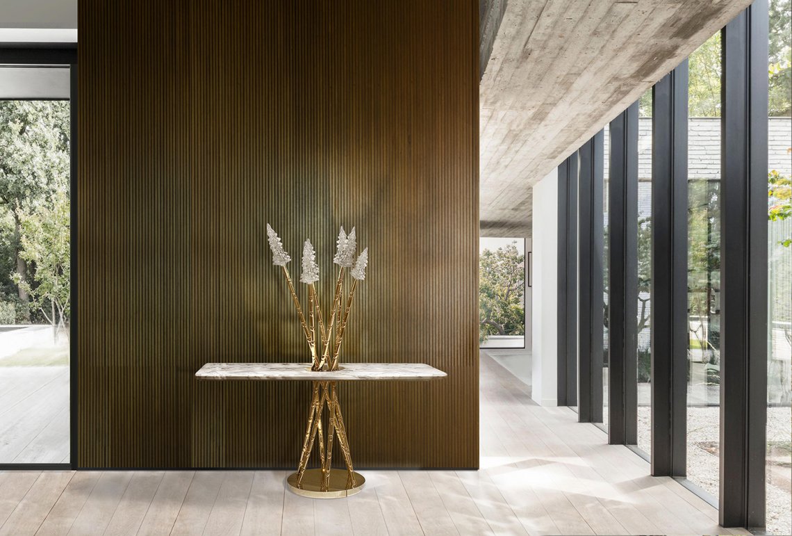 In Lewis console a bundle of metal pipes that ends up with handmade glass points crosses a precious marble top: the glass points, realized by master glassmakers in Venice area, are enlightened by leds placed inside of metal pipes. More than a piece of furniture this exclusive element is able to enhance a great atmosphere in a refined and elegant environment.