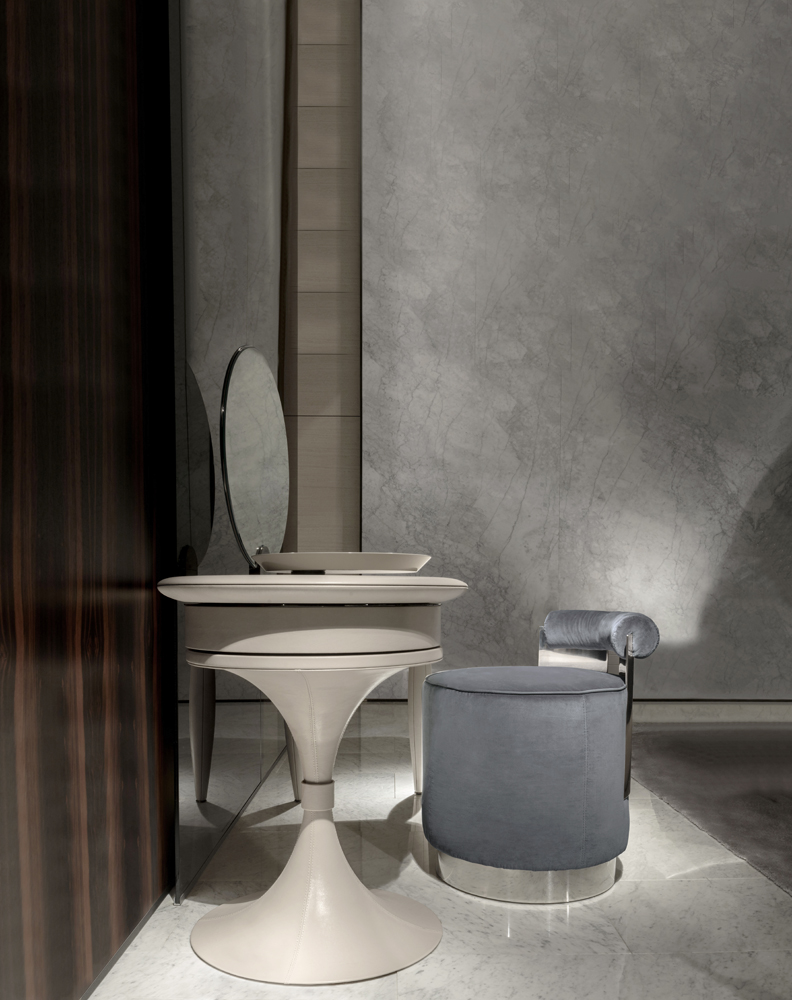 The colour and small dimensions of the cylindrical pouf Shelly make this item suitable for an elegant and refined living area. Available both in leather and fabric and in two different heights, this small armchair finds its best expression thanks to the printed leather with “pony” look.