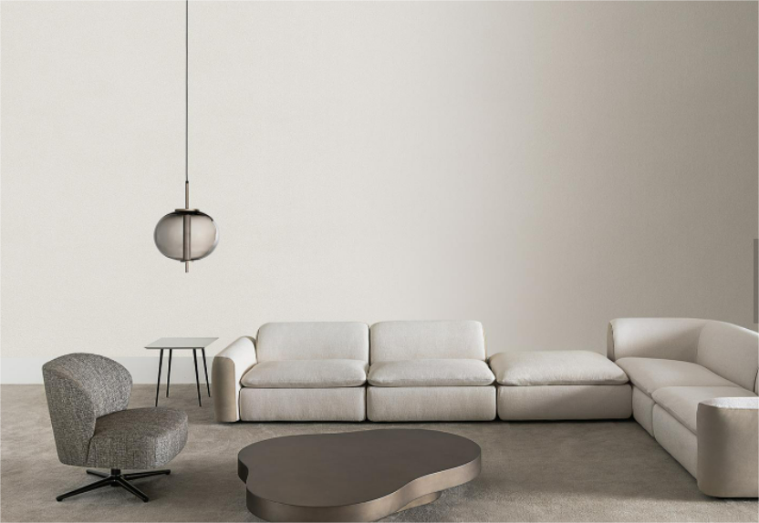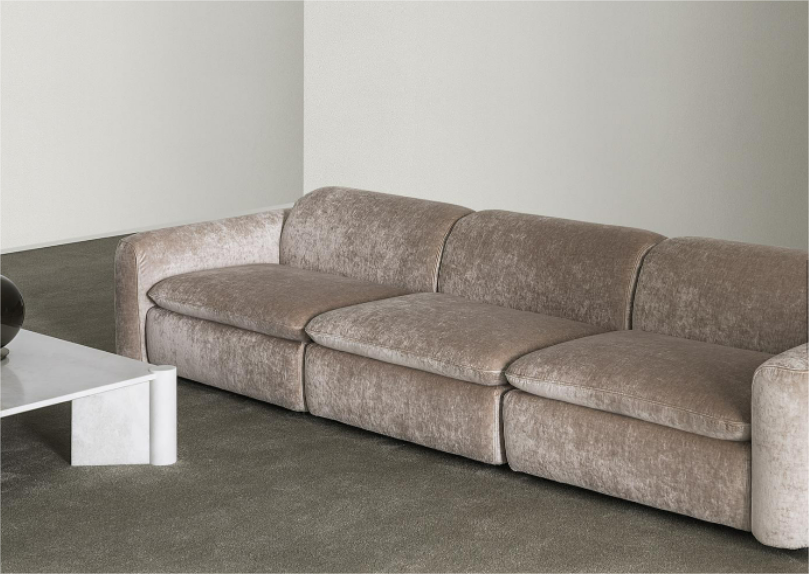 Modular seating system with a soft and harmonious line, characterized by the delicate curves of the armrests and backrest. It is possible to create a wide range of solutions with central elements, terminals, corners, chaise longue and open-end elements. Suitable for both residential and hospitality projects.