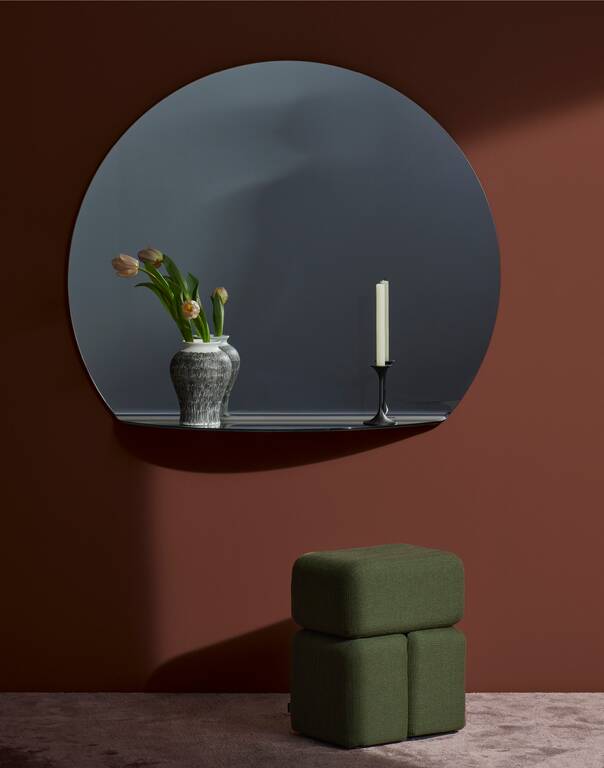 這是一面極簡而富有詩意的鏡子,正如Michael Anastassiades的一貫風(fēng)格。該作品融合了高超的工藝和技術(shù),為家居空間帶來了一種豐富的想象力,用于照鏡子的同時,仿佛與地平線融為一體,模擬出夕陽西下的景象。Gibbous是將一塊厚重的玻璃片放入烤爐中加熱數(shù)小時后制成的,高溫使部分玻璃片在自身重量的作用下變形,產(chǎn)生彎曲。鏡子的厚度適中,是精湛工藝的結(jié)果,彰顯了其獨特的個性。該系列包括兩款不同尺寸的版本,可根據(jù)所需高度以不同方式安裝在墻上,比如跨在兩面墻之間的夾縫上,或者掛在一個家具的上方,這種懸掛方式令Gibbous就像地平線上的太陽一樣融化在家具上。鏡面的更大區(qū)域還可輔以LED照明系統(tǒng),以擴(kuò)大光影重疊的效果。