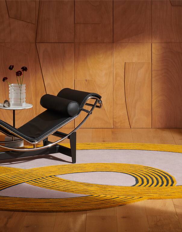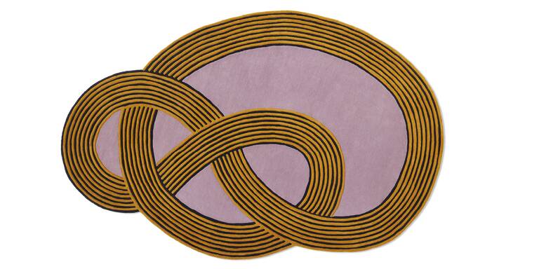 Patricia Urquiola設計的Rigadino標志著一種不拘一格的優雅,其靈感來自威尼斯歷史悠久的制造工藝。該地毯采用羊毛制成,以精美的紡織圖案重新詮釋了穆拉諾玻璃制品中典型的傳統條紋圖案。一條用“Rigadin”特有的黑色線條裝飾的厚實輪廓勾勒出了地毯的不規則周邊,各種形狀反復纏繞、交織,營造出一種令人著迷的形態游戲。Sestiere花瓶和No Vanitas鏡子采用了相同的四種色彩組合,包括海水綠配胡蘿卜紅輪廓、紫水晶配檸檬黃輪廓、黃玉配長春花輪廓、藍玉配石油綠輪廓,造就了一種連續感。