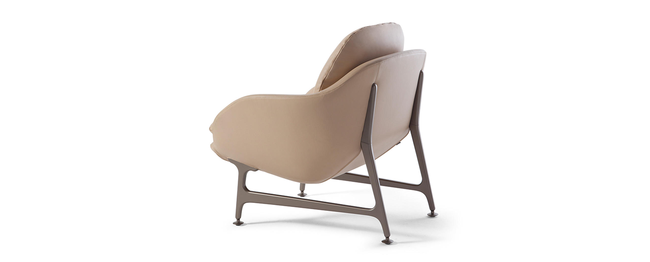 Poltrona, divano a due posti e divano a tre posti. Scocca in poliuretano espanso, privo di CFC, con cinghie elastiche, rivestita in tessuto o pelle amovibile. Basamento in fusione di alluminio lucido, oppure alluminio verniciato nei colori nero opaco o bronzo satinato. Piedini in materiale plastico. Cuscini di seduta in poliuretano espanso e ovatta di poliestere.