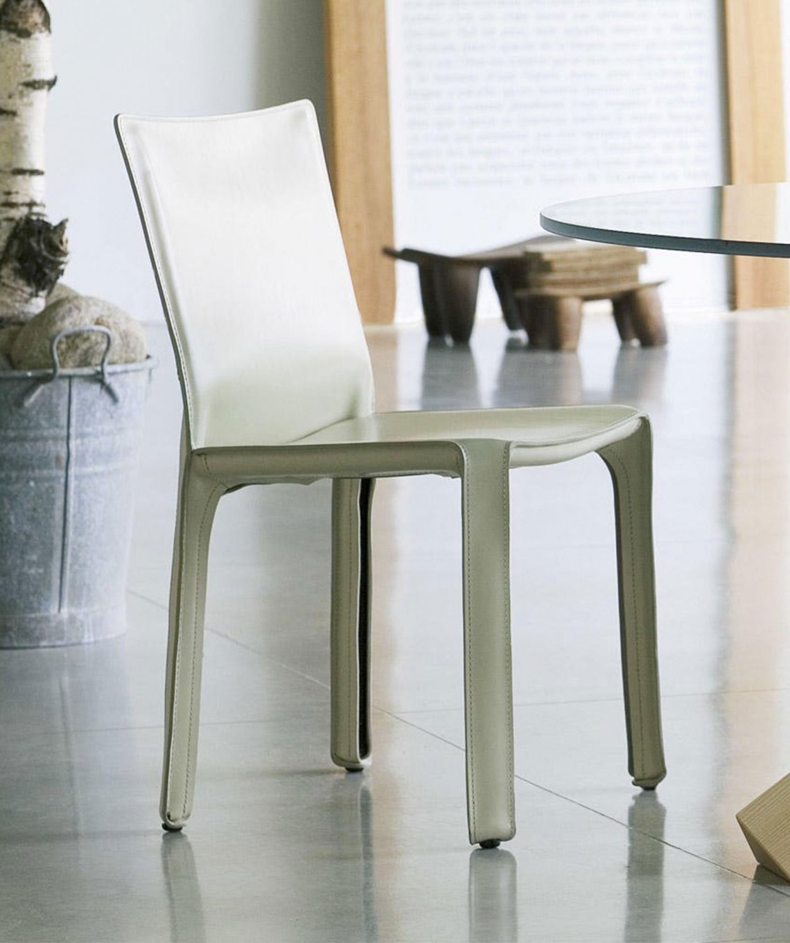 Cab is the first saddle-hide chair with a free-standing structure, inspired by the relationship between the skeleton and the skin. The individual pieces of saddle-hide are stitched together and the upholstery is then molded to a steel skeleton and closed with zippers, like a custom-tailored suit. The Cab version with armrests and stool completes the collection.