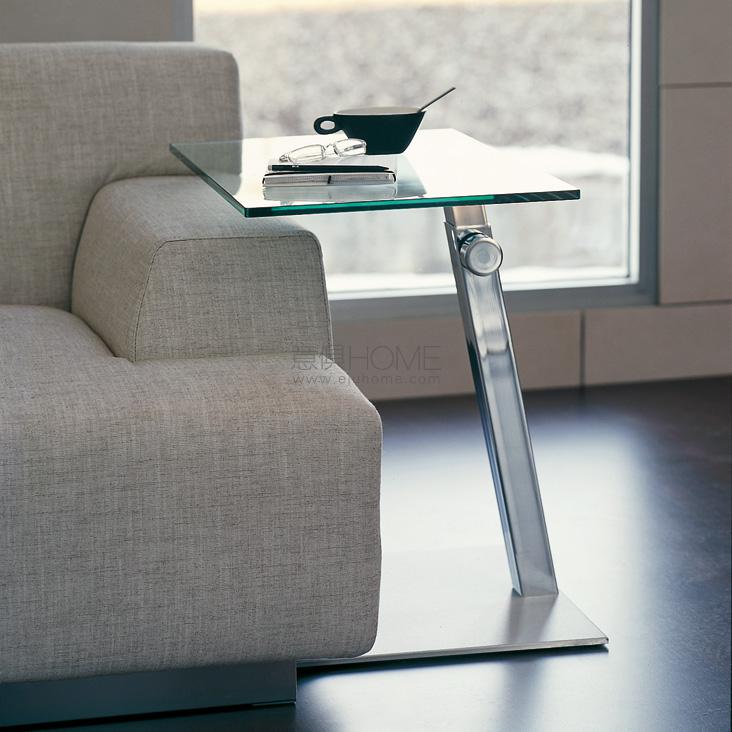 Side table or lap-top unit adjustable in height. Top in rectangular or shaped 12mm clear glass. Polished stainless steel base with chromed leg or covered in leather as per sample card.