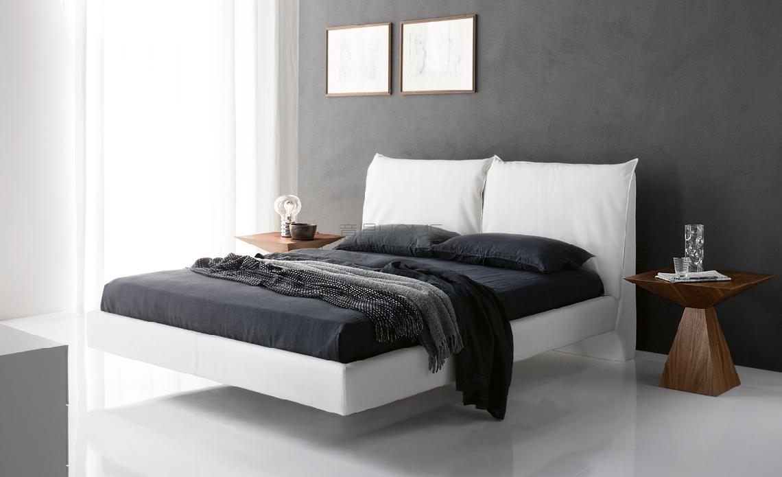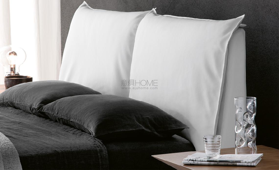Upholstered bed covered in fabric, synthetic nubuck, micro nubuck, synthetic leather or in soft leather as per sample card. With chromed (08) steel feet. Headboard with cushions. Slats included.