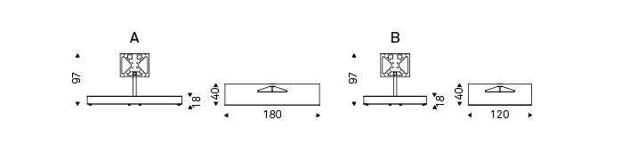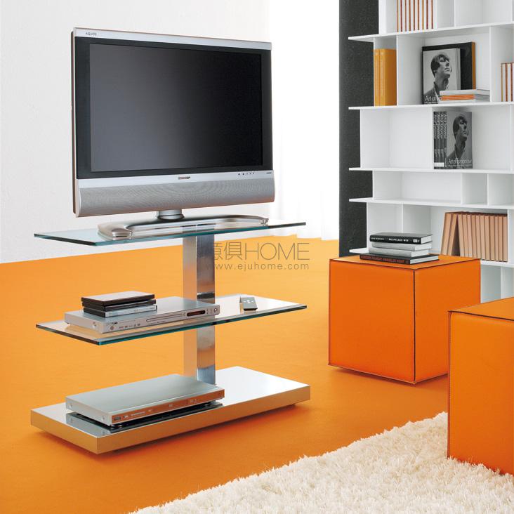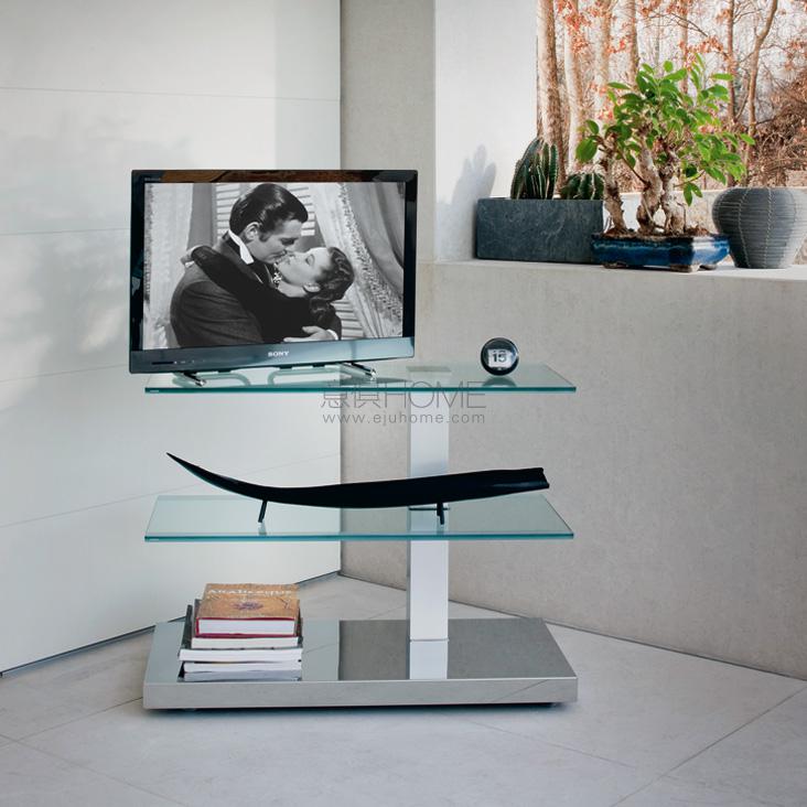 Flat TV unit on wheels with cable cover. Mixed (clear and frosted) glass shelves and polished stainless steel frame. Max capacity: total kg 35; glass shelf kg 10.