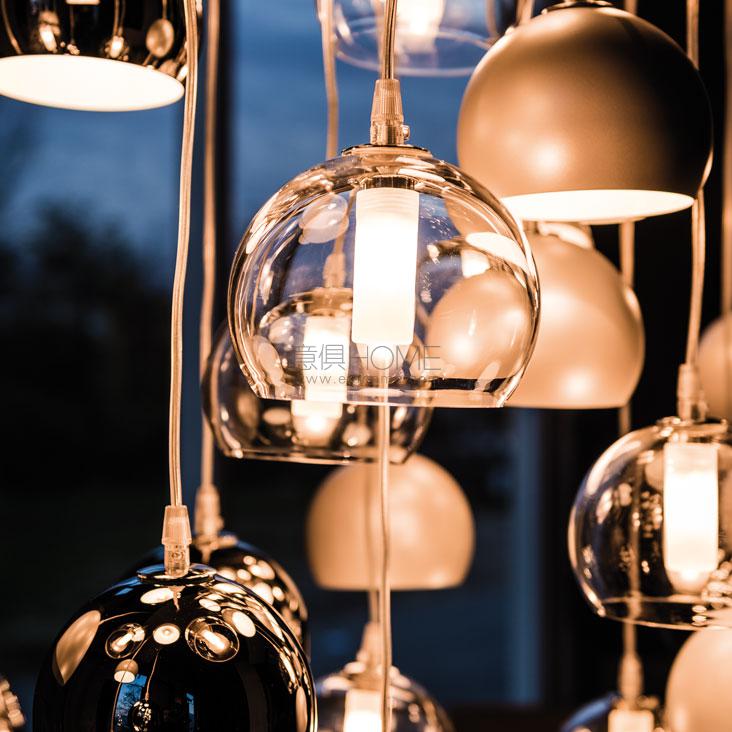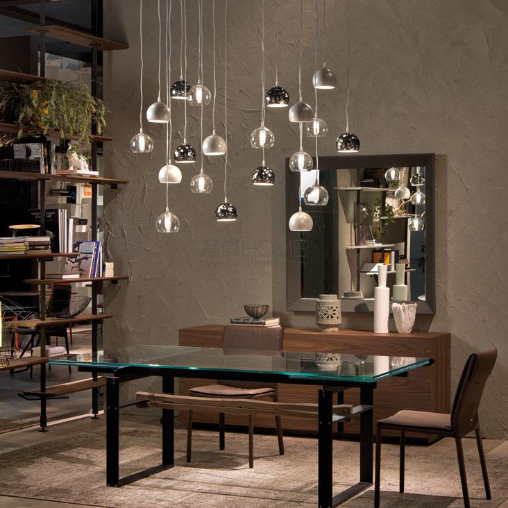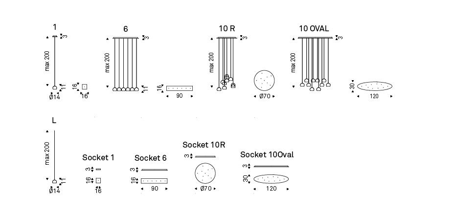Ceiling lamp with chromed (08) steel, borosilicate glass or pearl white painted steel lampshade. Ceiling plate in polished stainless steel. S1: single plate. S6: rectangular ceiling plate for 6 lampshades. S10R: round ceiling plate for 10 lampshades. S10oval: oval ceiling plate for 10 lampshades. Bulb included.