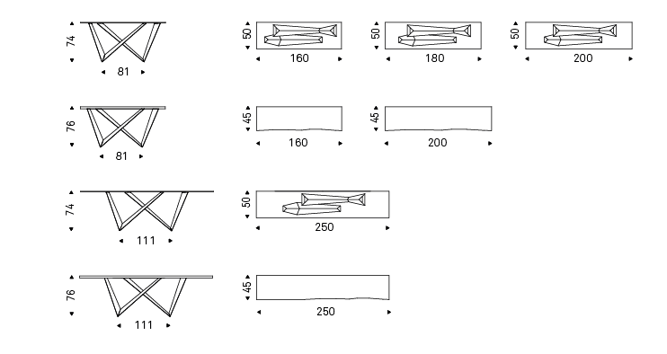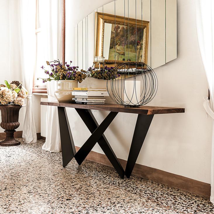 Console with base in titanium (GFM11), bronze (GFM18), graphite (GFM69), white (GFM71), black (GFM73) or mix (GFM69-GFM71) embossed lacquered steel, Brushed Bronze or Brushed Grey steel. 12mm top in clear, extra clear glass or Canaletto walnut (NC), burned oak (RB) or natural oak (RN) with solid wood irregular edges. Wall anchorage is necessary.