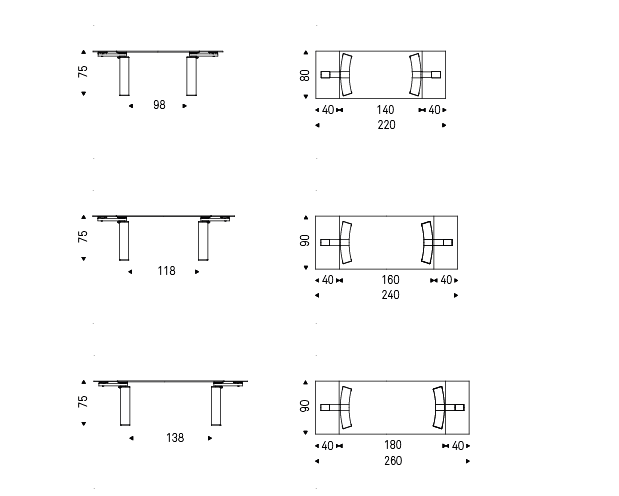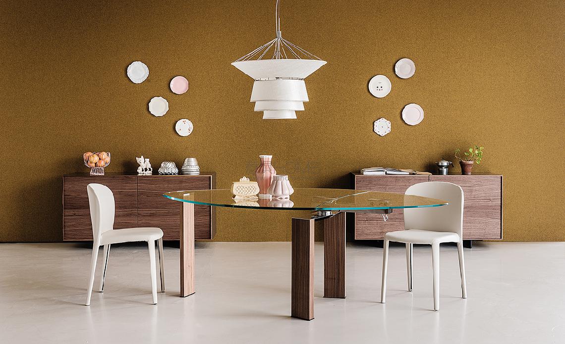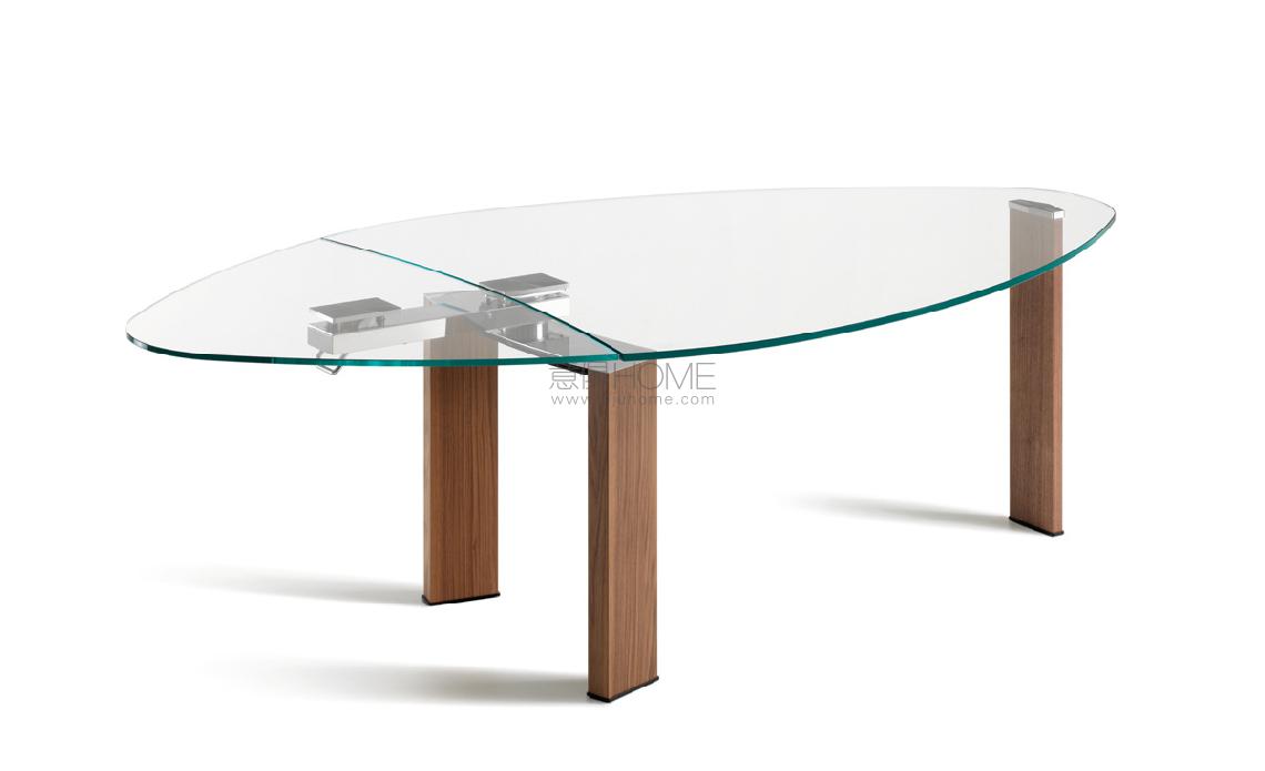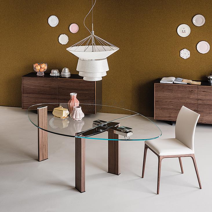 Extendible table with legs in polished stainless steel or Canaletto walnut (NC). Top and extensions in tempered clear glass or extra clear glass (top 15mm, extensions 12mm). Polished stainless steel mechanism.