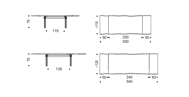 Extendible table with 15mm extra clear tempered glass base and graphite (OP69) beam. Top and extensions in Canaletto walnut (NC), burned oak (RB) or natural oak (RN) with irregular solid wood edges. Available also with Canaletto walnut (NC), burned oak (RB) or natural oak (RN) beam.