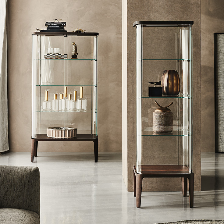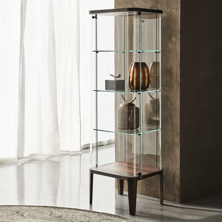 Extra clear glass showcase with top and bottom in Canaletto walnut (NC), burned oak (RB), natural oak (RN). Extra clear glass shelves. With led light. Max capacity: each shelf kg 6.