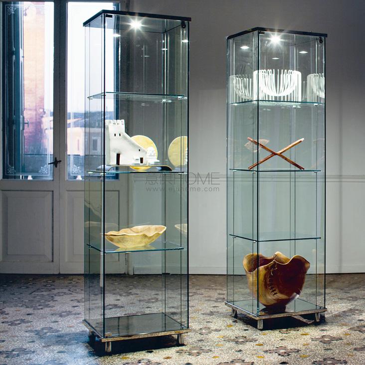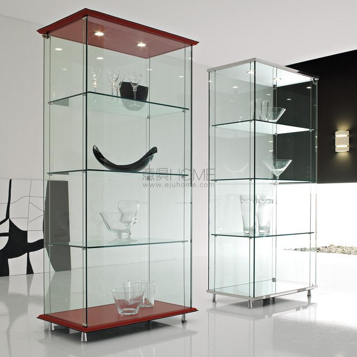 Clear glass showcase with chromed (08) feet. Top and bottom either in polished stainless steel or covered in leather as per sample card. With led lights. Max capacity: each shelf kg 7.