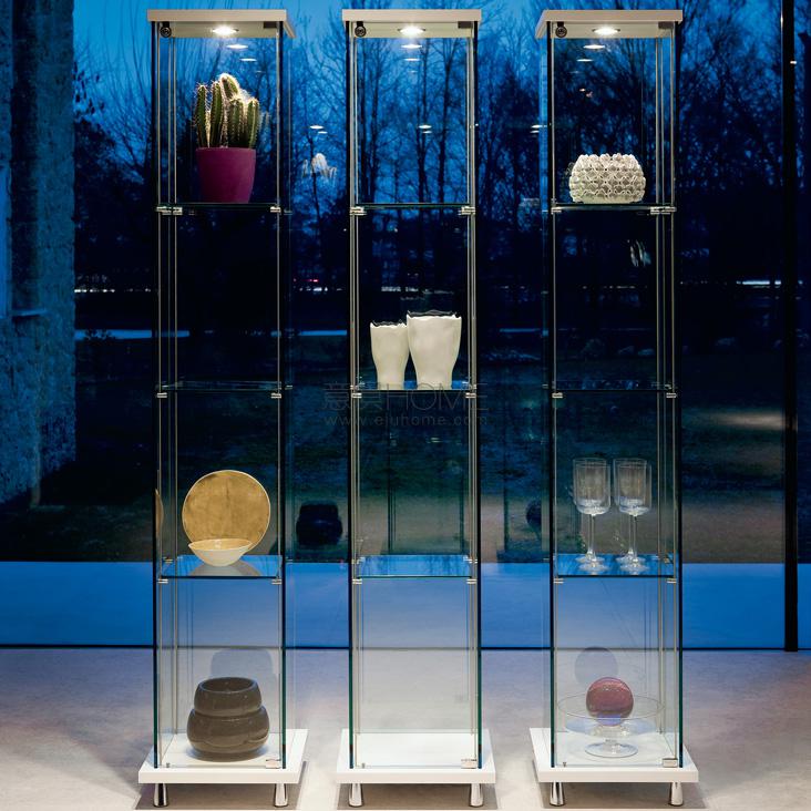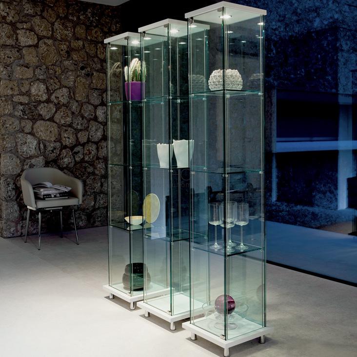 Clear glass showcase with top and bottom in Canaletto walnut (NC) or white (OP7) stained beechwood. Chromed (08) steel feet. With led light. Max capacity: each shelf kg 7.